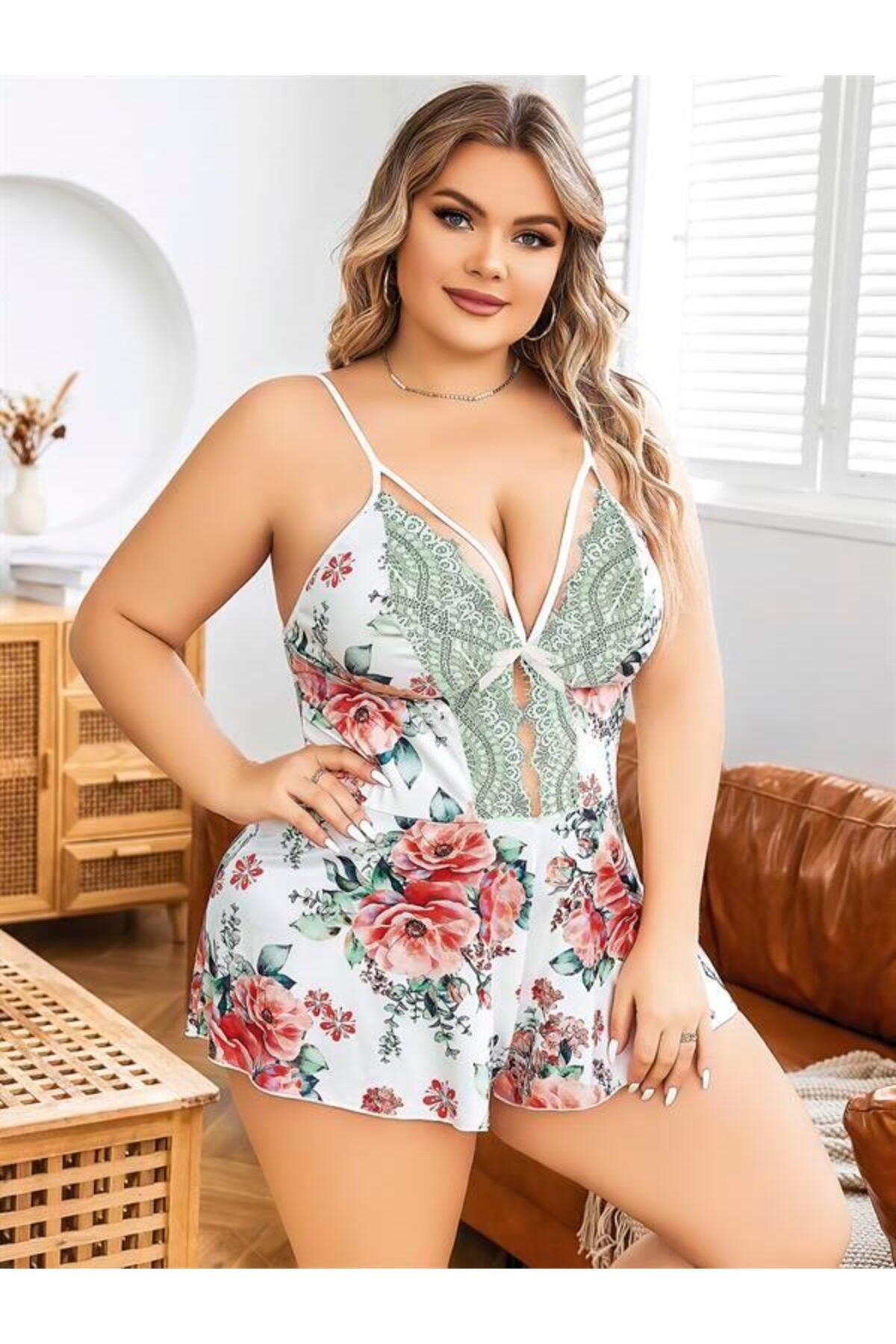 Büyük Beden Beyaz Üstüne Çiçek Desenli Dantel İşlemeli İnce Askılı Şort Gecelik