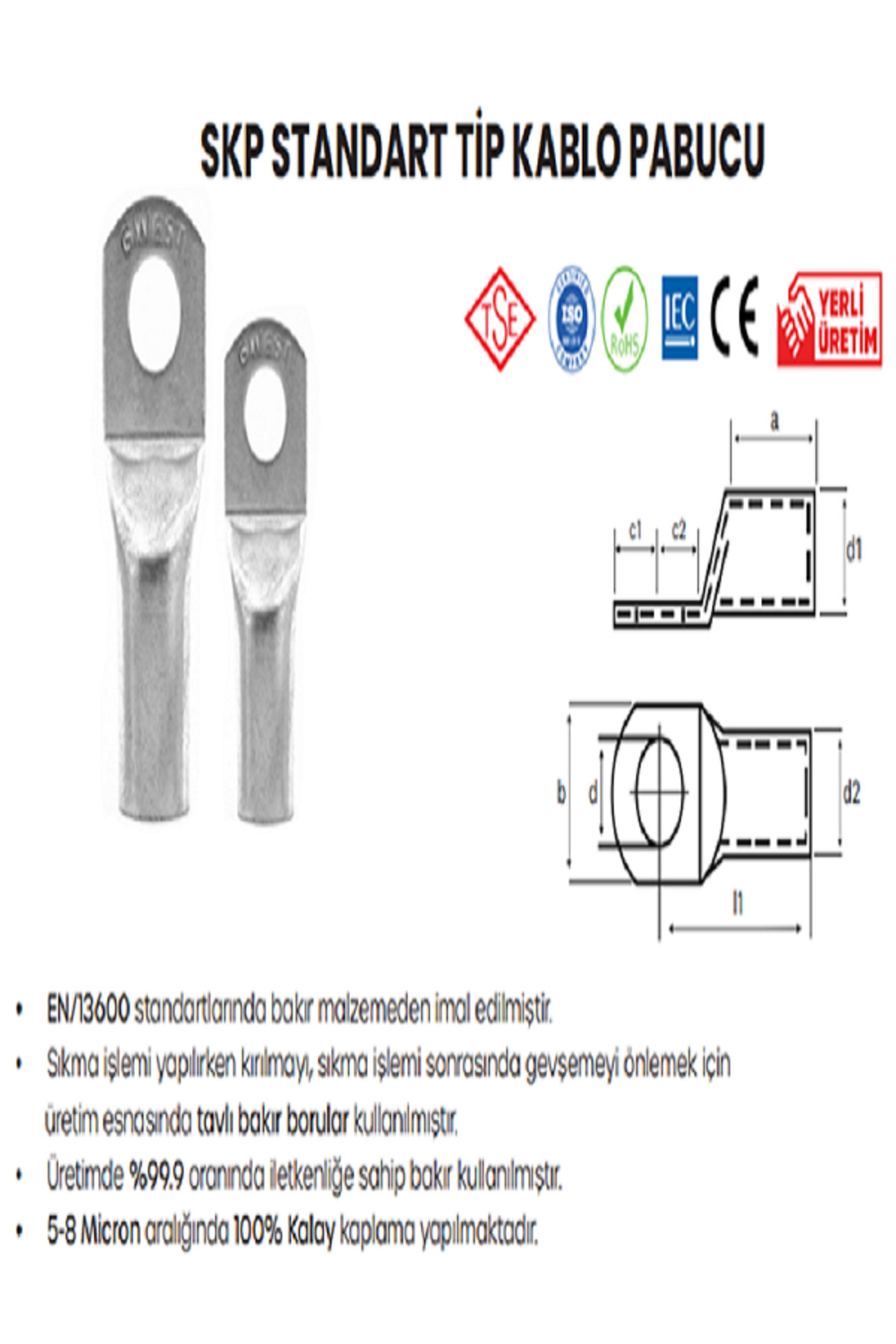- 120 MM SKP standart tip kablo pabucu, elektrik tesisatlarında güvenli ve sağlam bağlantılar için idealdir.