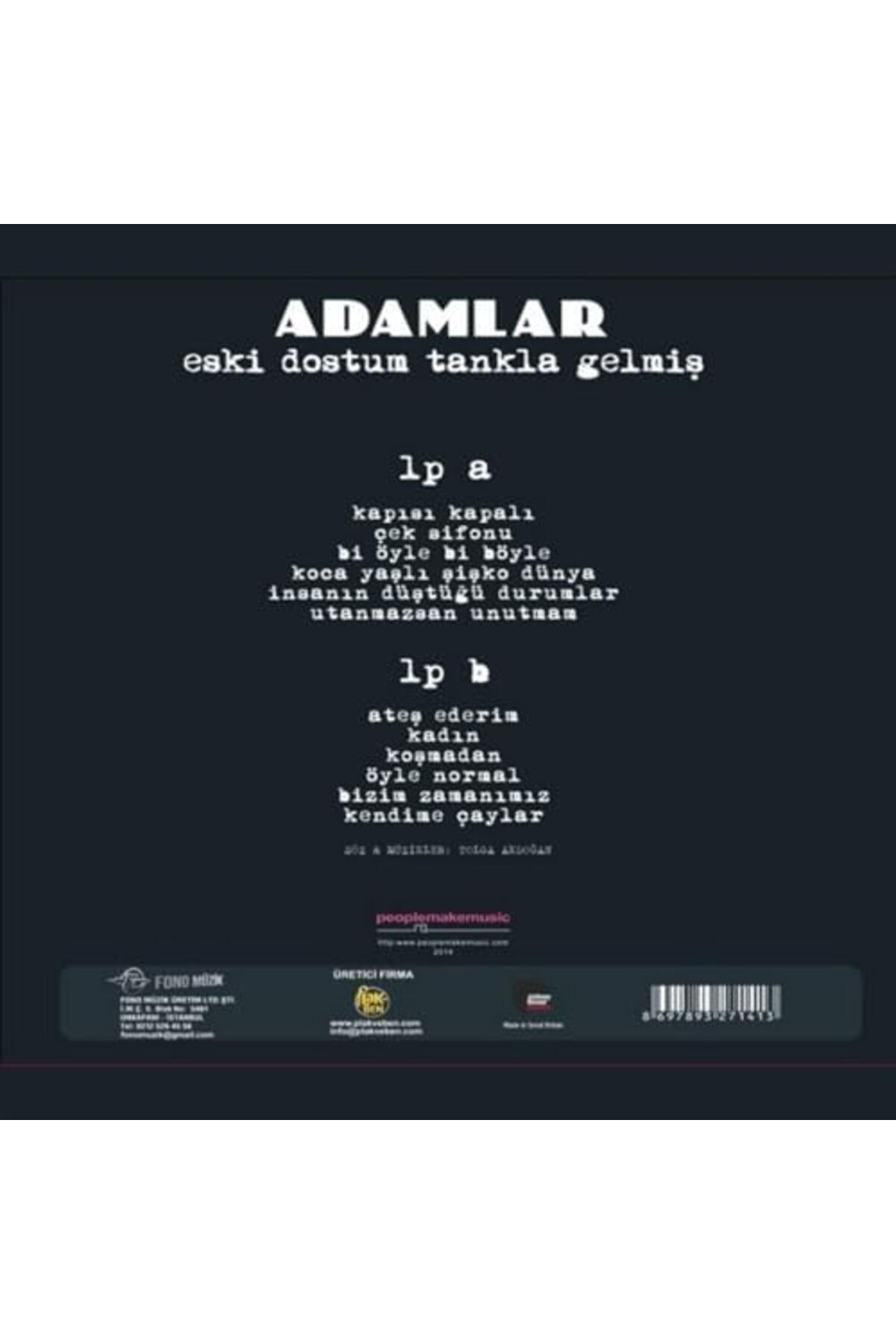 A Yüzü: A1 – Kapısı kapalı A2 – Çek sifonu A3 – Bi öyle bi böyle A4 – Koca yaşlı şişko dünya A5 – İnsanın düştüğü A6 – Utanmazsan unutmam B Yüzü: B1 – Ateş derin B2 – Kadın B3 – Koşmadan B4 – Öyle normal B5 – Bizim zamanımız B6 – Kendime çaylar Müzik My - - Eski Dostum Tankla Gelmiş - Plak - Lp Müzik My - - Eski Dostum Tankla Gelmiş - Plak - Lp