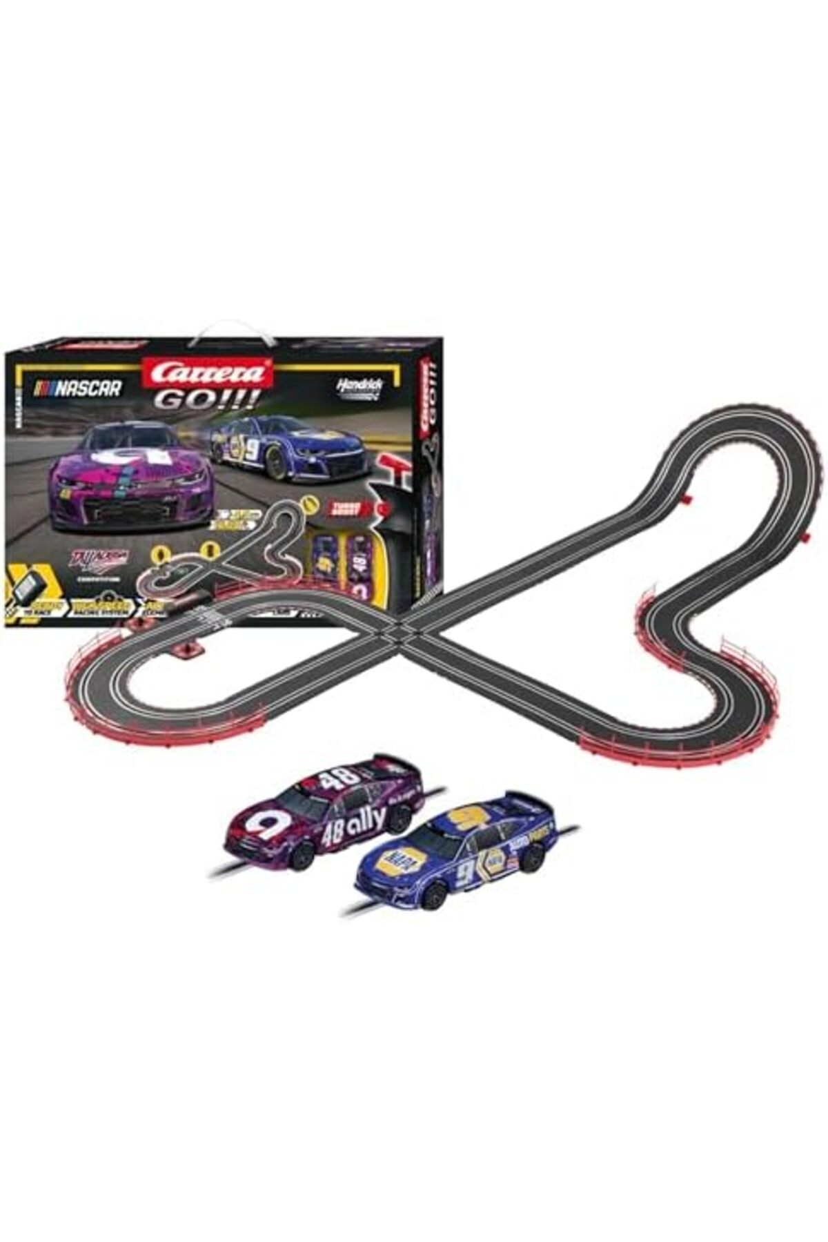Turbo düğmeli hız kumandası 1:43 ölçekli 2 adet yarış arabası Kurulduğunda 182 x 115 cm'lik alan gerektirir GO Nascar Talladega Müsabakası
