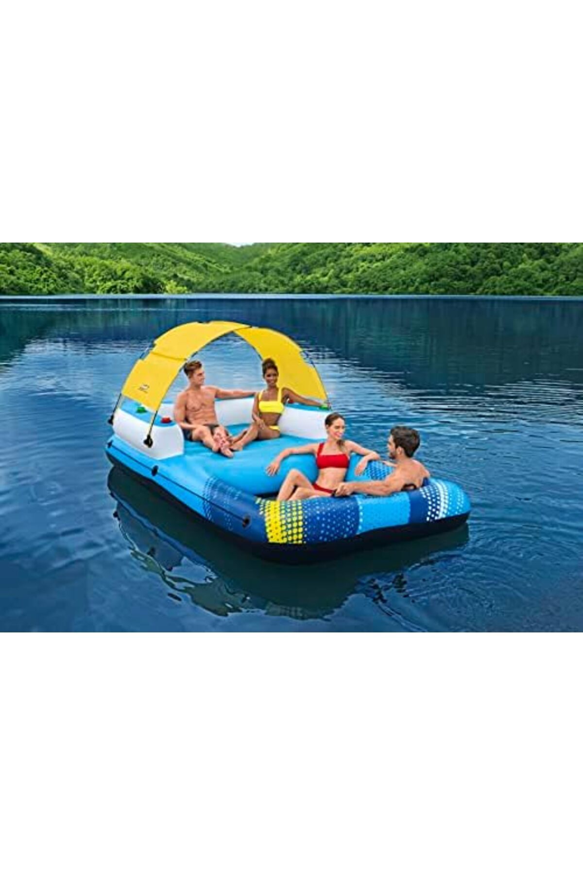 Inflata-Shield delinmeye karşı dirençli, gerilmeyi sınırlayan ve kavramayı kolaylaştıran malzeme Ekstra geniş yastık arkalık Tarz file oturma alanı Güçlü güneş ışığından koruma için güneşlik Hydro– Summer Oasis 4 Kişilik Şişirilebilir Ada 3,05 m x 1.86 m x 58 cm