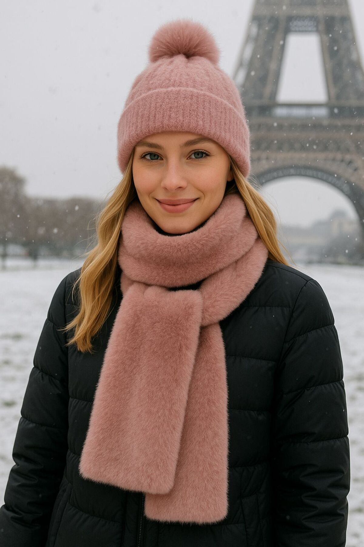 Ponponlu Kılçıllı bere ve peluş boyunluk olarak set halindedir.