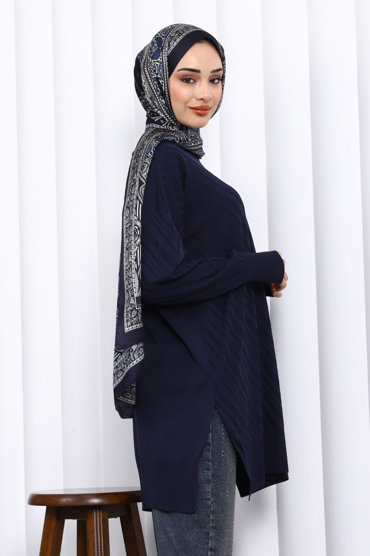 - Lacivert rengiyle şıklığı ve rahatlığı bir arada sunan bisiklet yaka triko tunik.