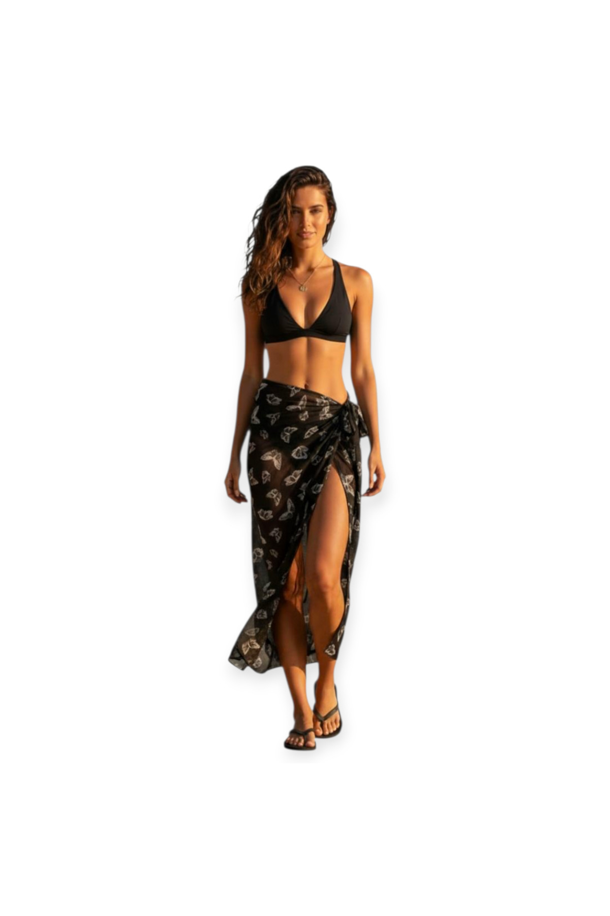 Siyah üzeri beyaz kelebek desenli yumuşacık yandan bağlamalı uzun pareo
