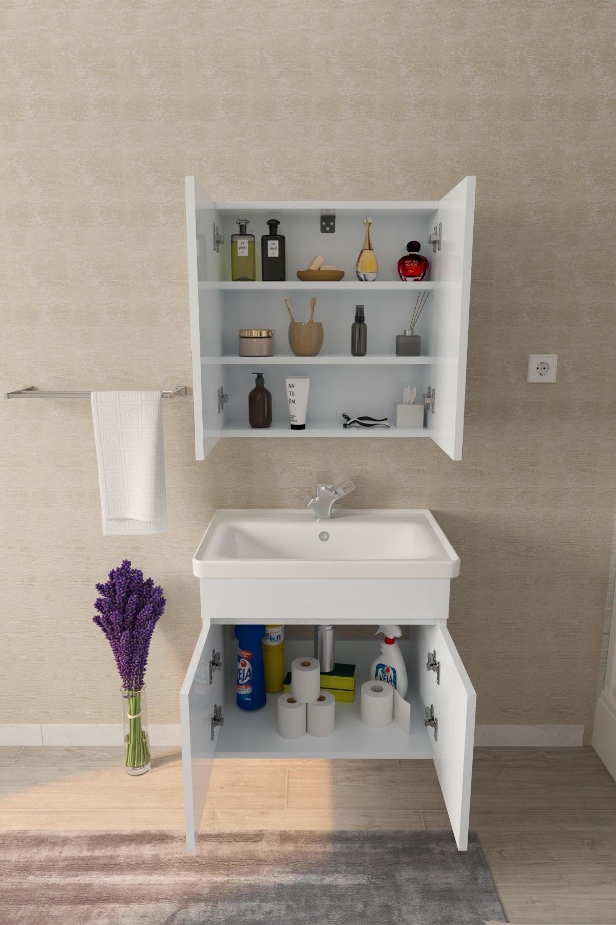 - Modern tasarımıyla banyonuza şıklık katan Tokyo 65cm Seramik Lavabolu MDF Aynalı Banyo Dolabı, 4 kapaklı ( 2 üst - 2 alt ) yapısıyla geniş depolama alanı sunar.