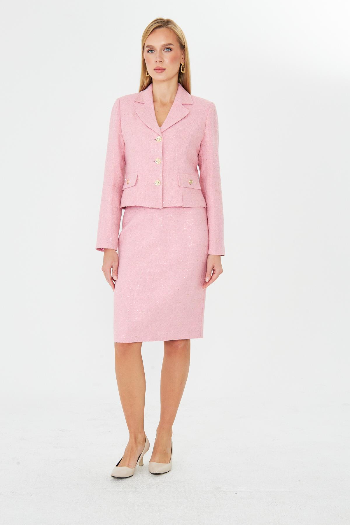 Gold Düğmeli Tüvit Etekli Takım Pembe