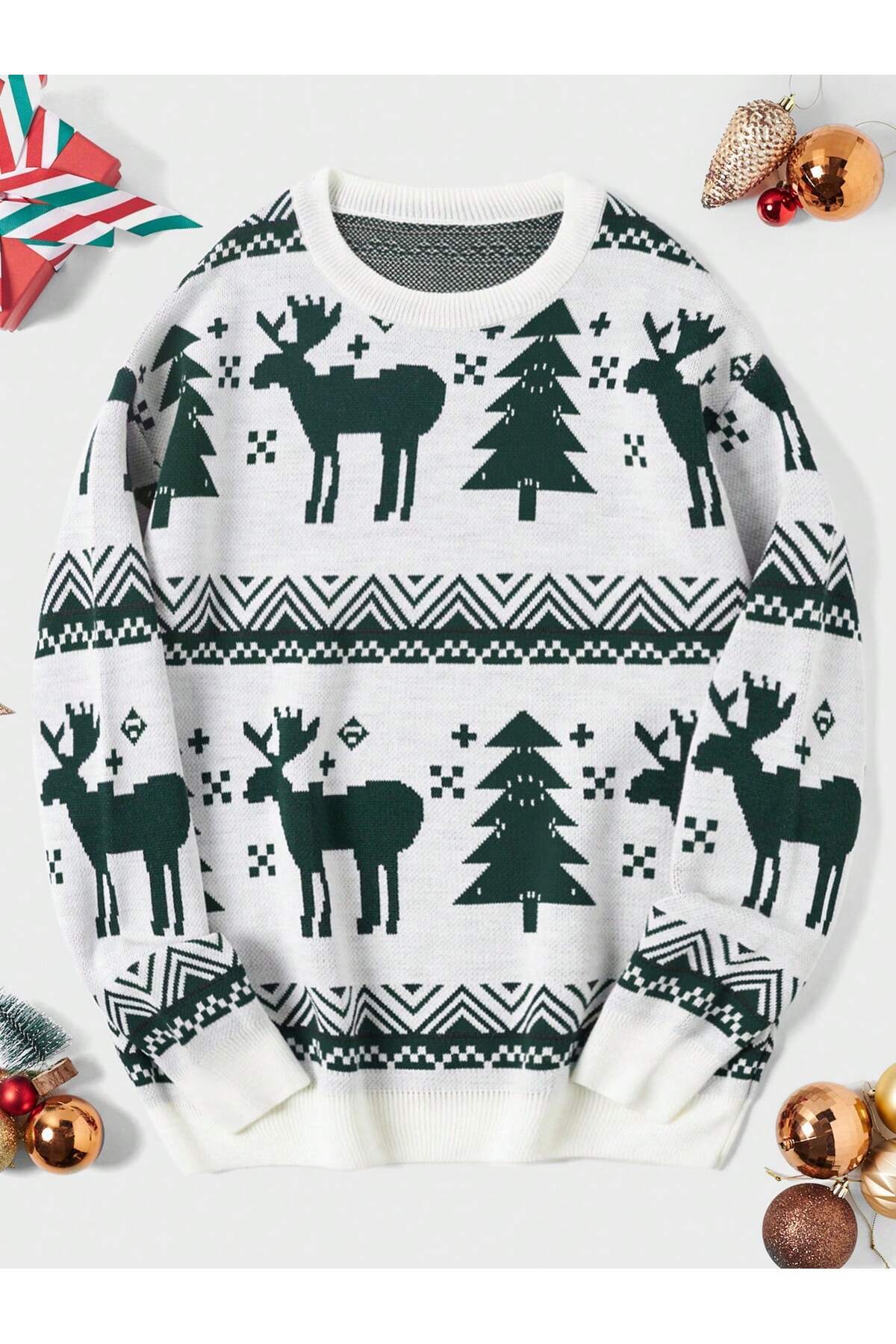 BELLA WELL ERKEK YEŞİL BEYAZ BİSİKLET YAKA JAKARLI GEYİKLİ YÜN YILBAŞI KAZAK