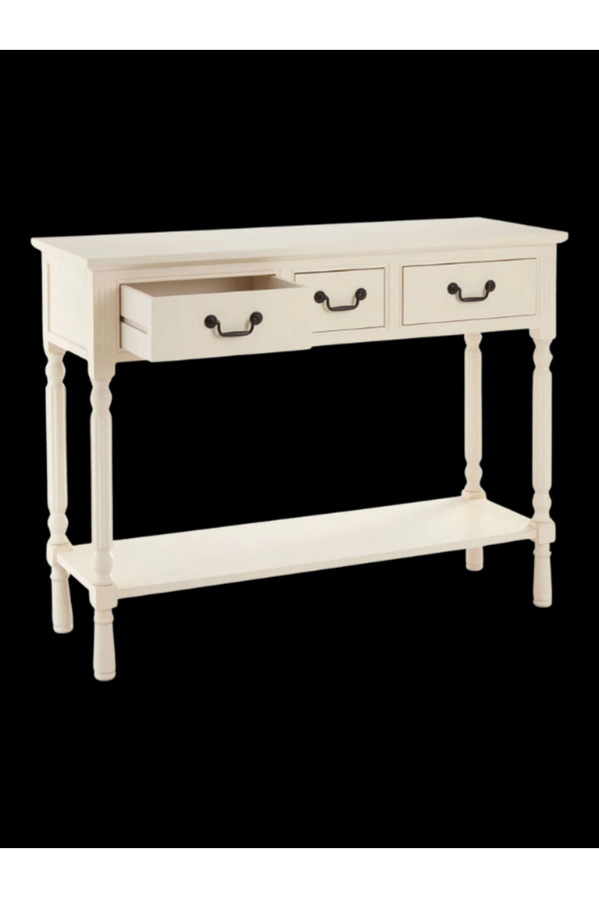 Zarif işlemeli ayakları, geniş kullanım alanı sunan alt rafı ve metal kulp detaylarıyla hem dekoratif hem de pratik bir konsol masadır.
