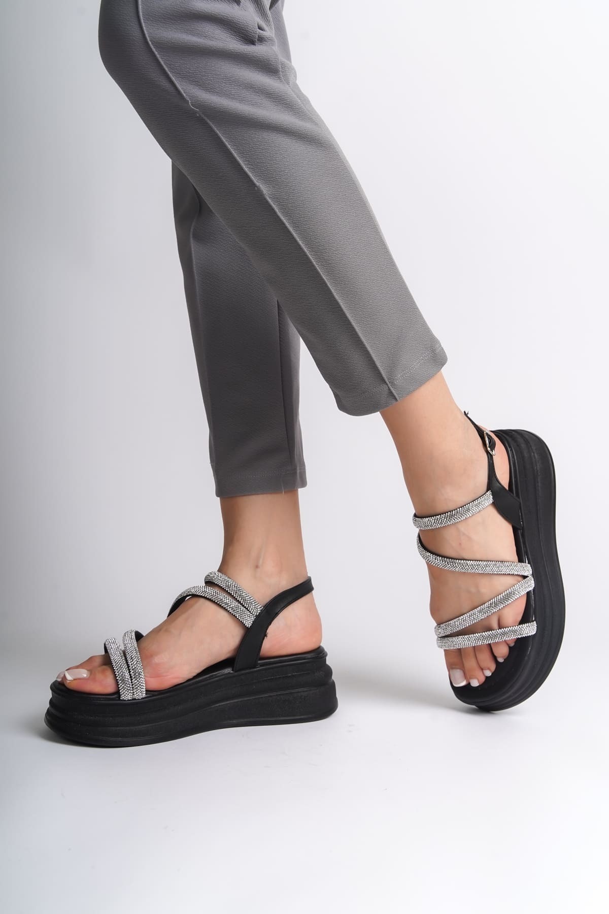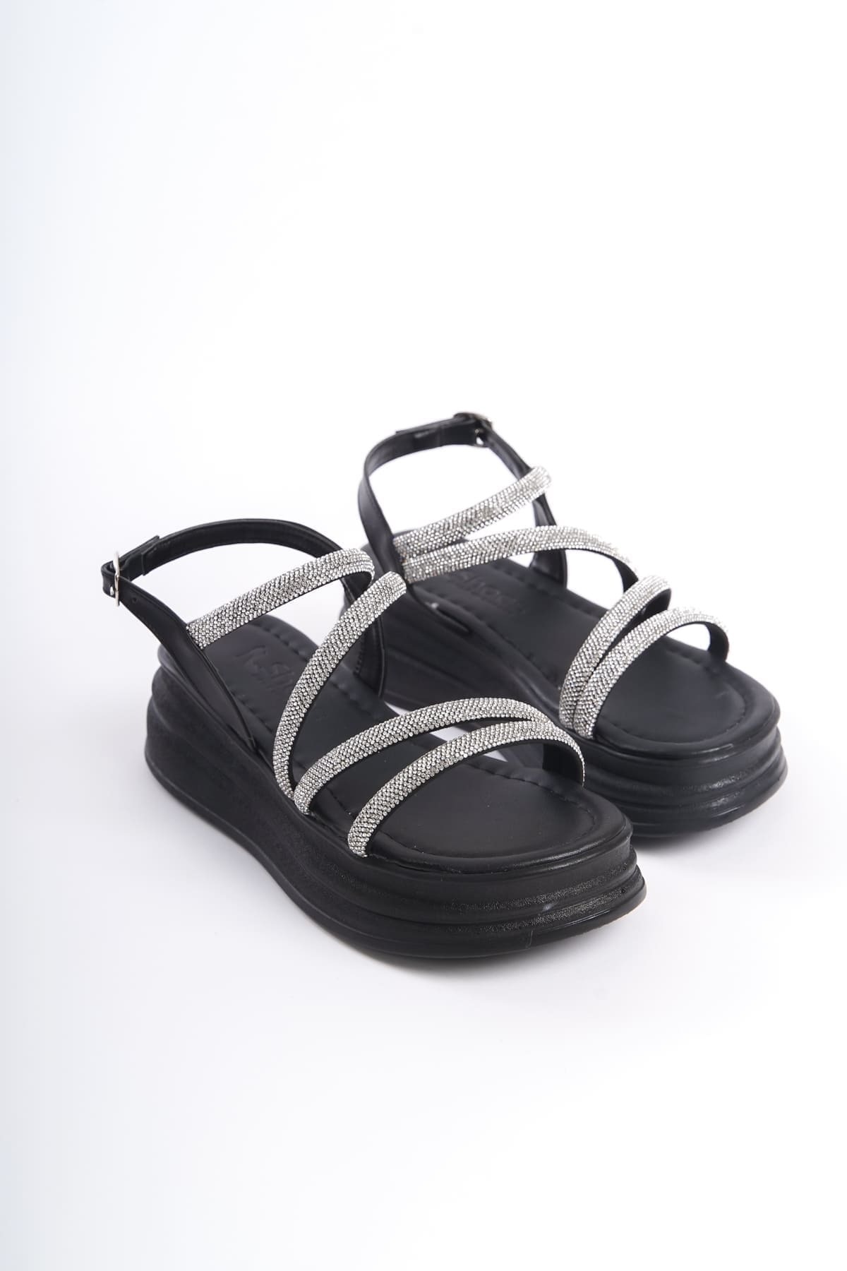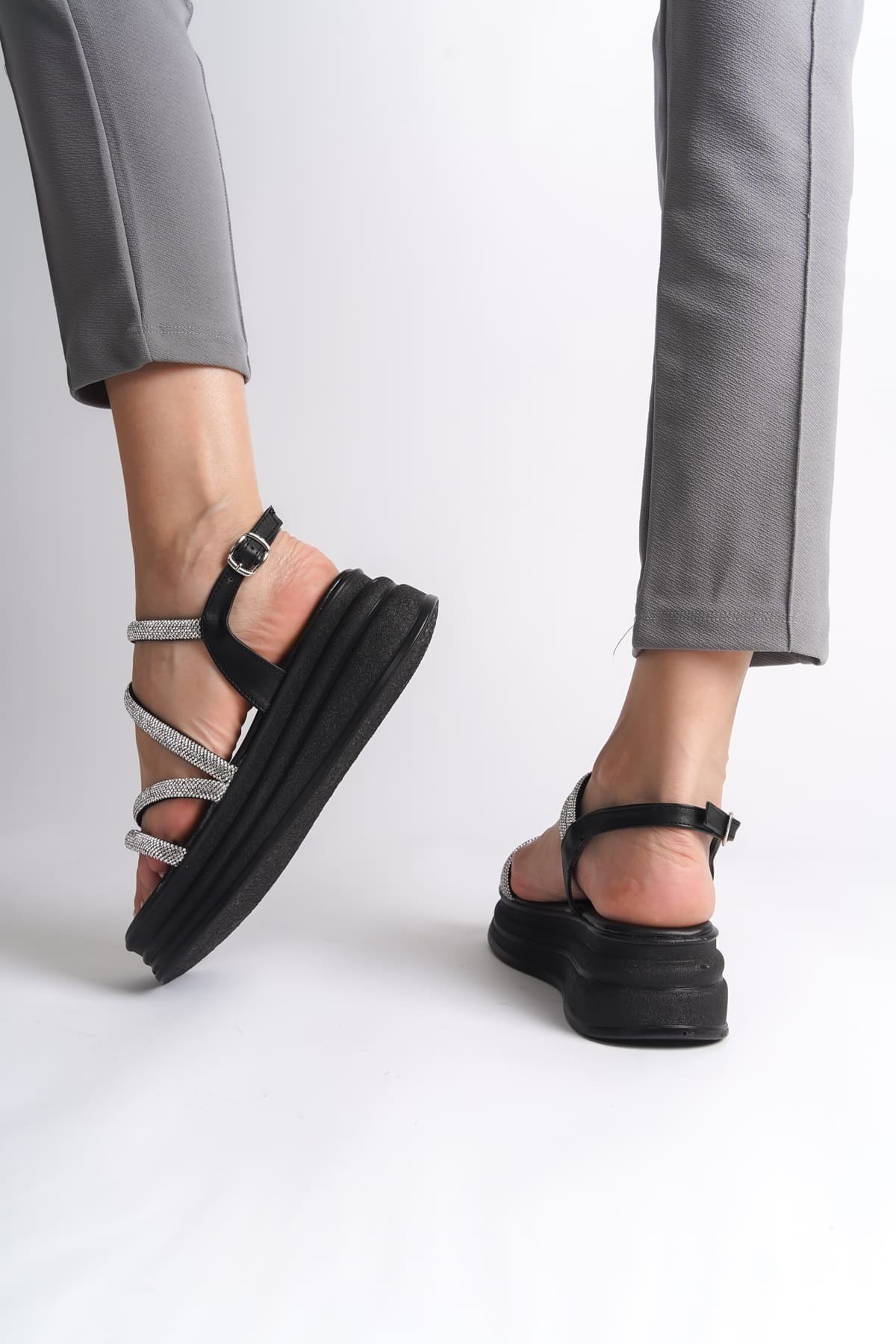 RILEY İnce Tokalı Taşlı Şeritli Ortopedik Taban Kadın Sandalet CST - Siyah