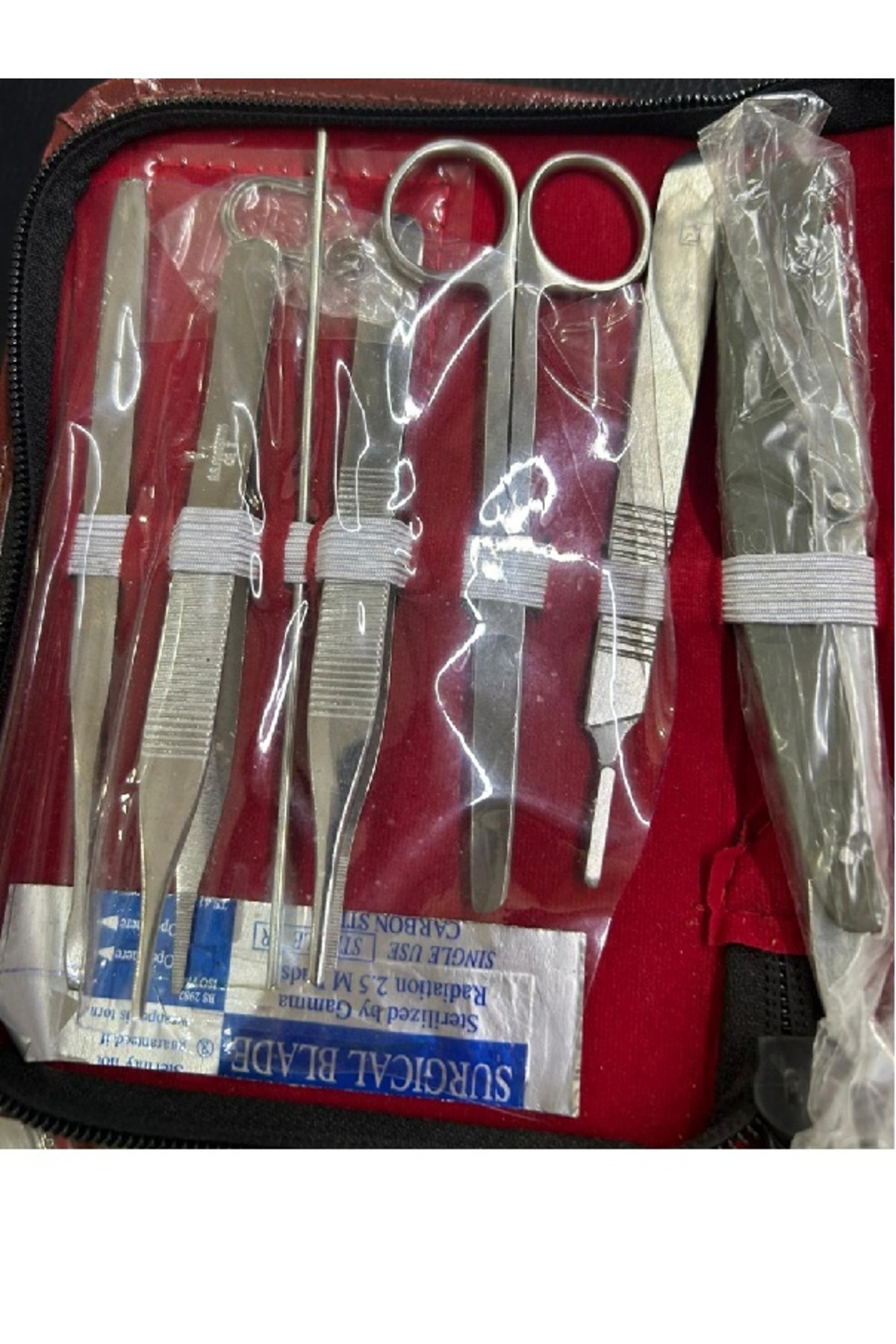 Ürün İçeriği: Set içerisinde yer alan başlıca aletler: • Cerrahi makas • Küçük ve büyük bistüri sapı • Steril cerrahi bistüri ucu (2 adet, ayrı paketli) • Anatomik ve cerrahi pensler • Diseksiyon iğnesi • Küçük ve büyük uçlu spatulalar • Penset (cımbız tipi) • Makas (düz ve kavisli uçlu) • Tutan pens (kilitli hemostat) • Küçük kazıyıcı uçlu aletler Tüm parçalar paslanmaz çelik malzemeden üretilmiş olup, kolay temizlenebilir ve sterilizasyona uygundur.