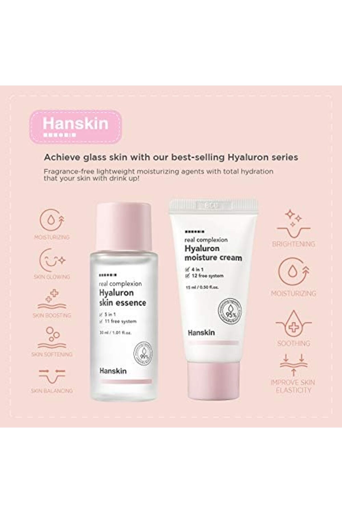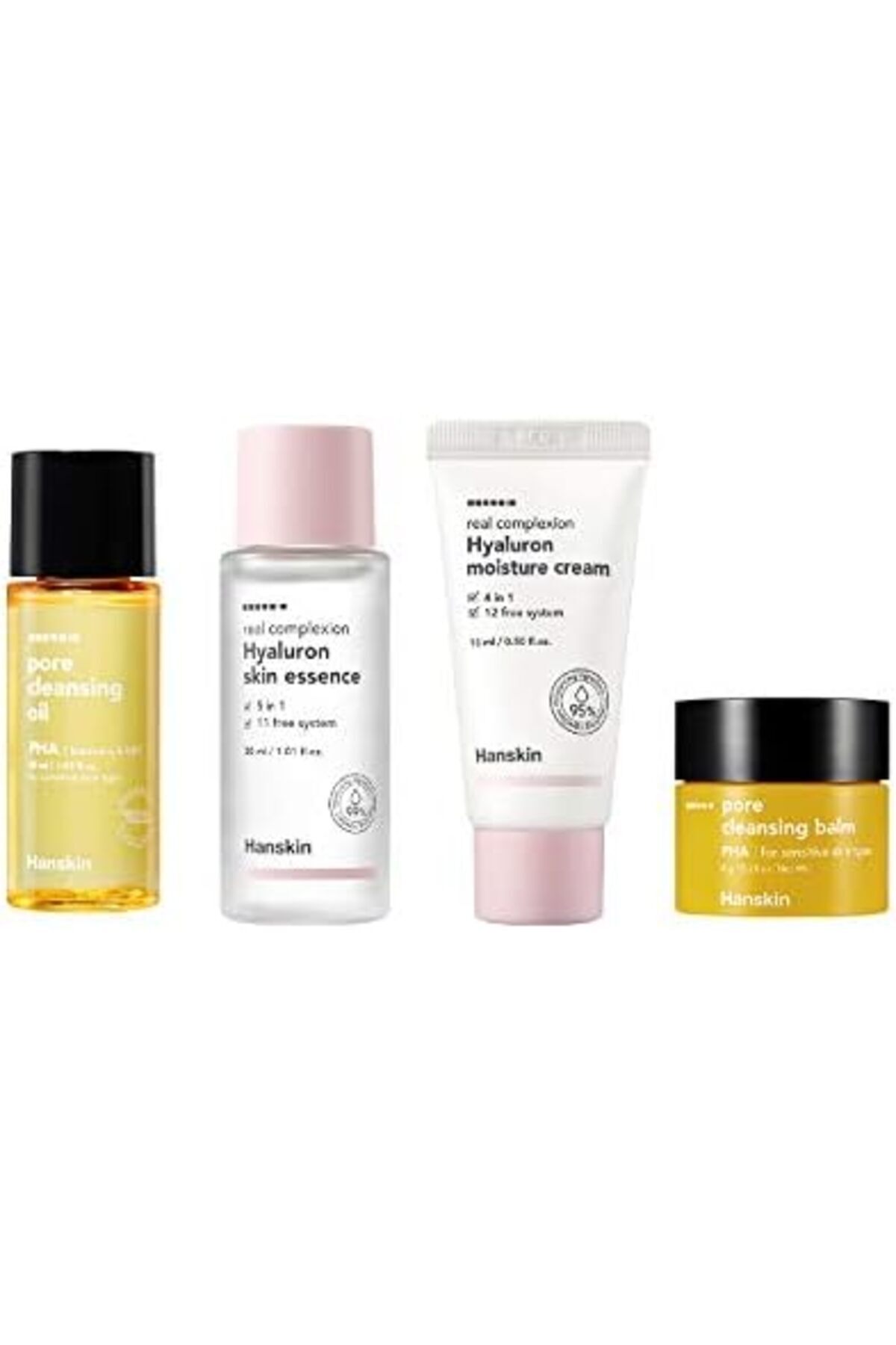 Hareket halindeyken ışıltılı cam bir cilt için Hanskin'in Temel Seyahat Cilt Bakım Seti! Bu kit, seyahat ederken cildinizi temiz, dengeli ve süper nemli tutmak için iki temizleyici, bir nemlendirici öz ve bir nemlendirici krem içerir Adım 1 - PHA Gözenek Temizleme Yağı:Bu temizleme yağı makyajı eritirken polihidroksi asitler parlak bir cilt ortaya çıkarır Adım 2 - Hyaluron Cilt Esansı Parlak formüllü toner/esans karışımı, cildinizi hyaluronik asitle nemlendirir.