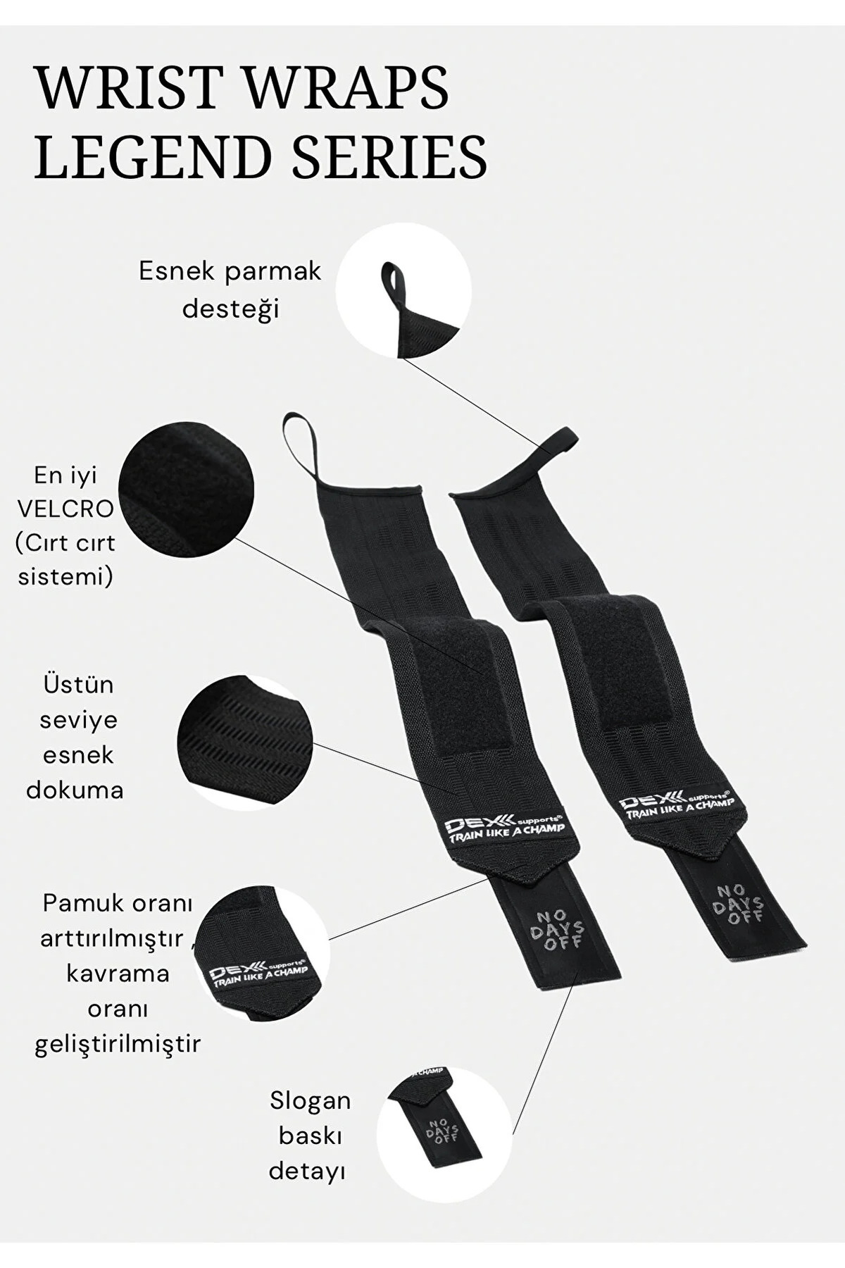 Bilekleri destekleyen, tekrarlar sırasında bilek yorgunluğunu en aza indirmeye yardımcı olan ve bilekleri sakatlanmalara karşı korumaya destekçi olan Dex Supports Wrist wraps Legend Series.