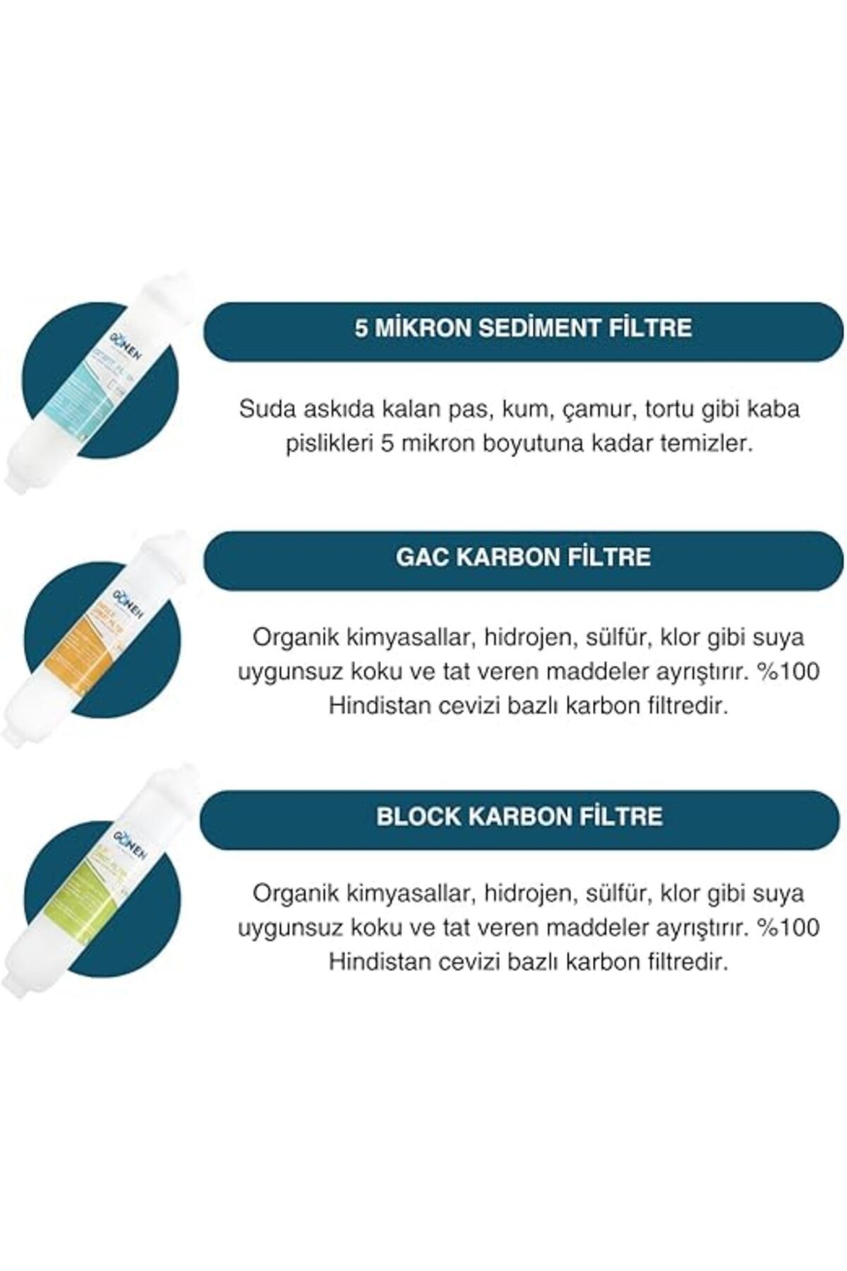 Bu ürün hakkındaSediment Filtre: filtrede suda askıda kalan pas, kum, çamur, tortu gibi kaba pislikleri 5 mikron boyutuna kadar temizler.