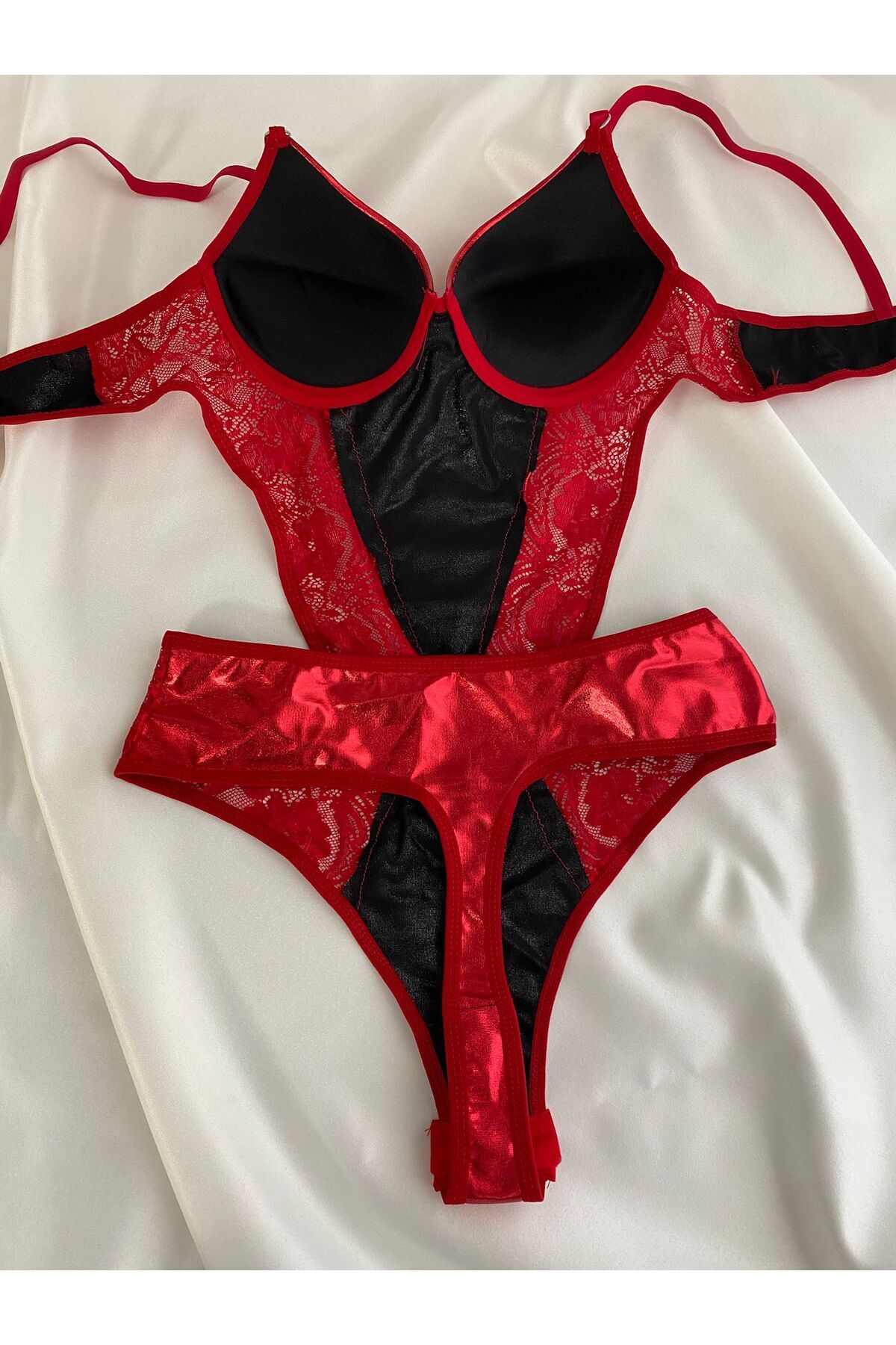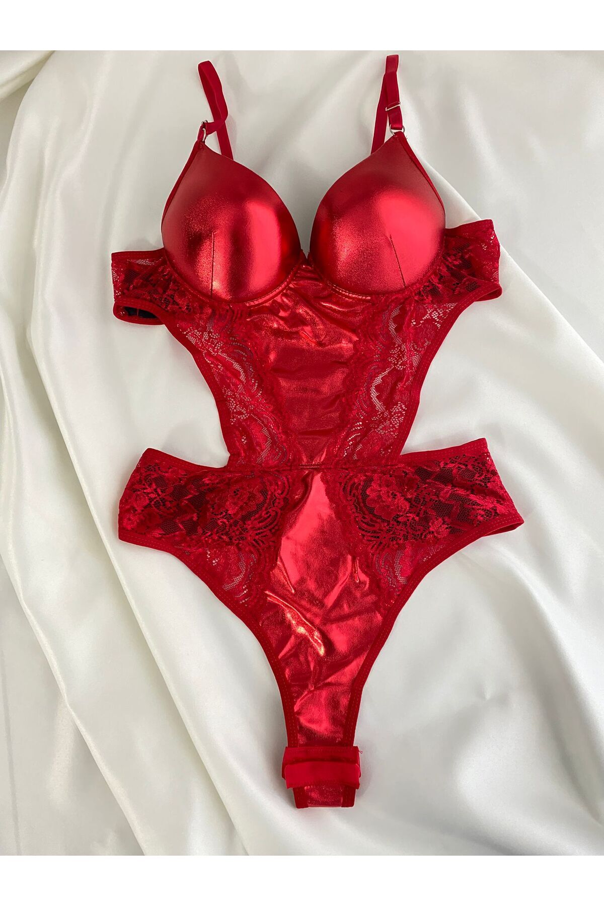 Kadın Dantelli Deri Kırmızı Transparan Çıtçıtlı Sütyenli Body Bodysuit Fantezi İç Çamaşır
