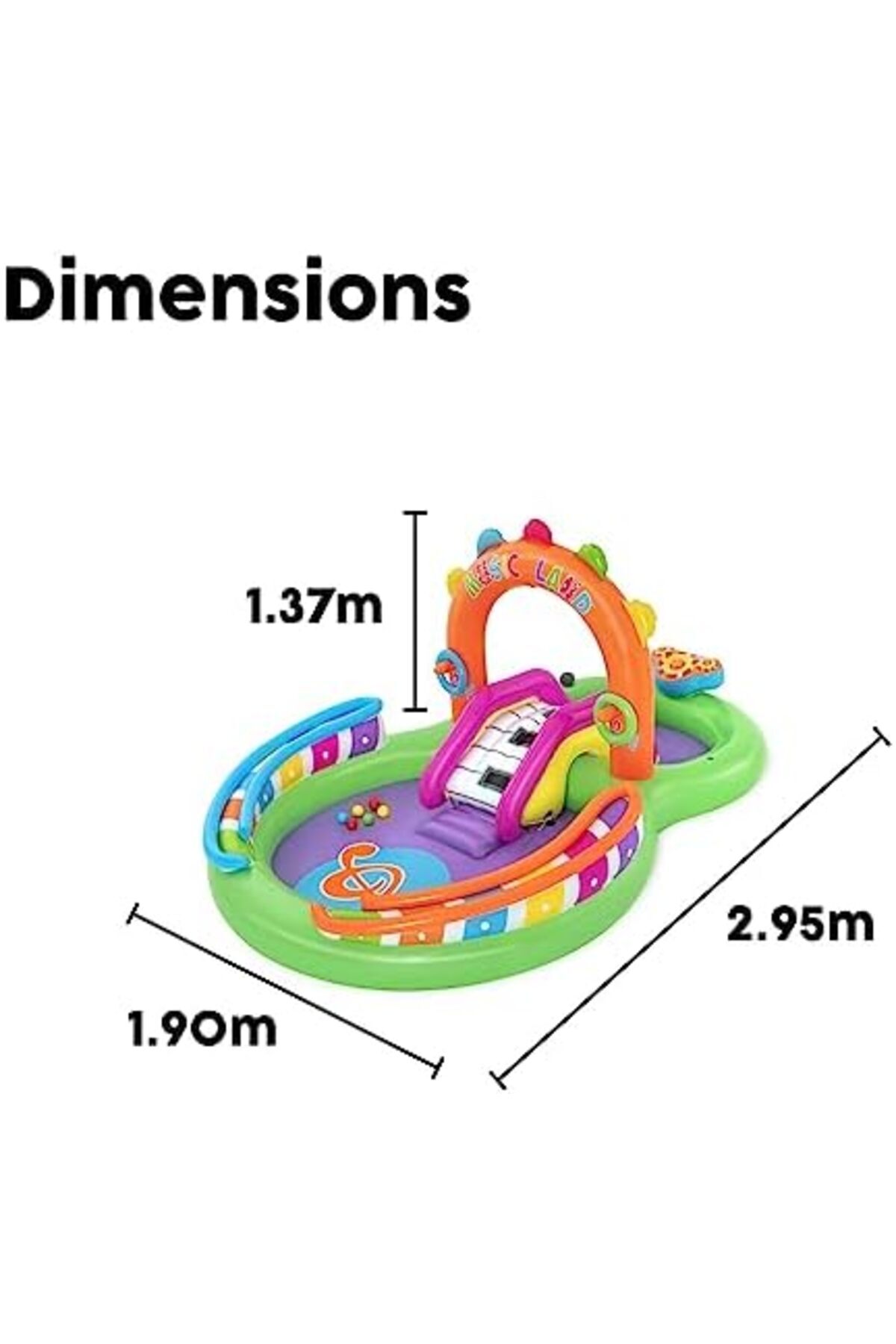 Çekme iplerine ve gövde üstü bağlantı halkalarına sahip sökülebilir kaydırak Dahili püskürtücülü kemer ve halka atma oyun alanı Birlikte verilen toplara sahip iki atış alanı Havuz zemini ilave kayma rahatlığı için şişirilebilir iniş yastığına sahiptir Sing 'n Splash Şişirilebilir Çocuk Su Oyun Merkezi Sing 'n Splash Şişirilebilir Çocuk Su Oyun Merkezi