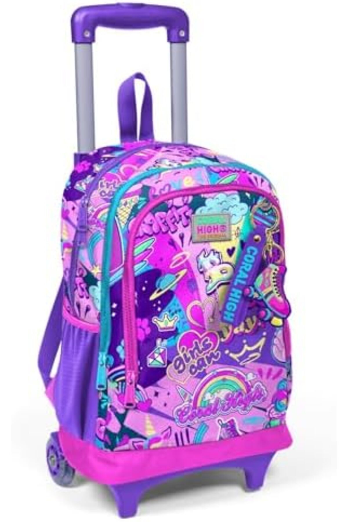 Güncel renk ve motif seçenekleri ile tasarlanmıştır Tekerlekler ettikçe dört farklı renkte LED aydınlatma yanar Çantanın ana gözü daha sağlam ve güvenli olması için çift fermuar sürgüsüne sahiptir Çantanın yan kısımlarında 2 adet esnek file malzemeden suluk ve aksesuar cebi bulunmaktadır Çekçek iki kademelidir Çekçek Sırt Çanta (Işıklı Tekerlek) Çekçek Sırt Çanta (Işıklı Tekerlek)
