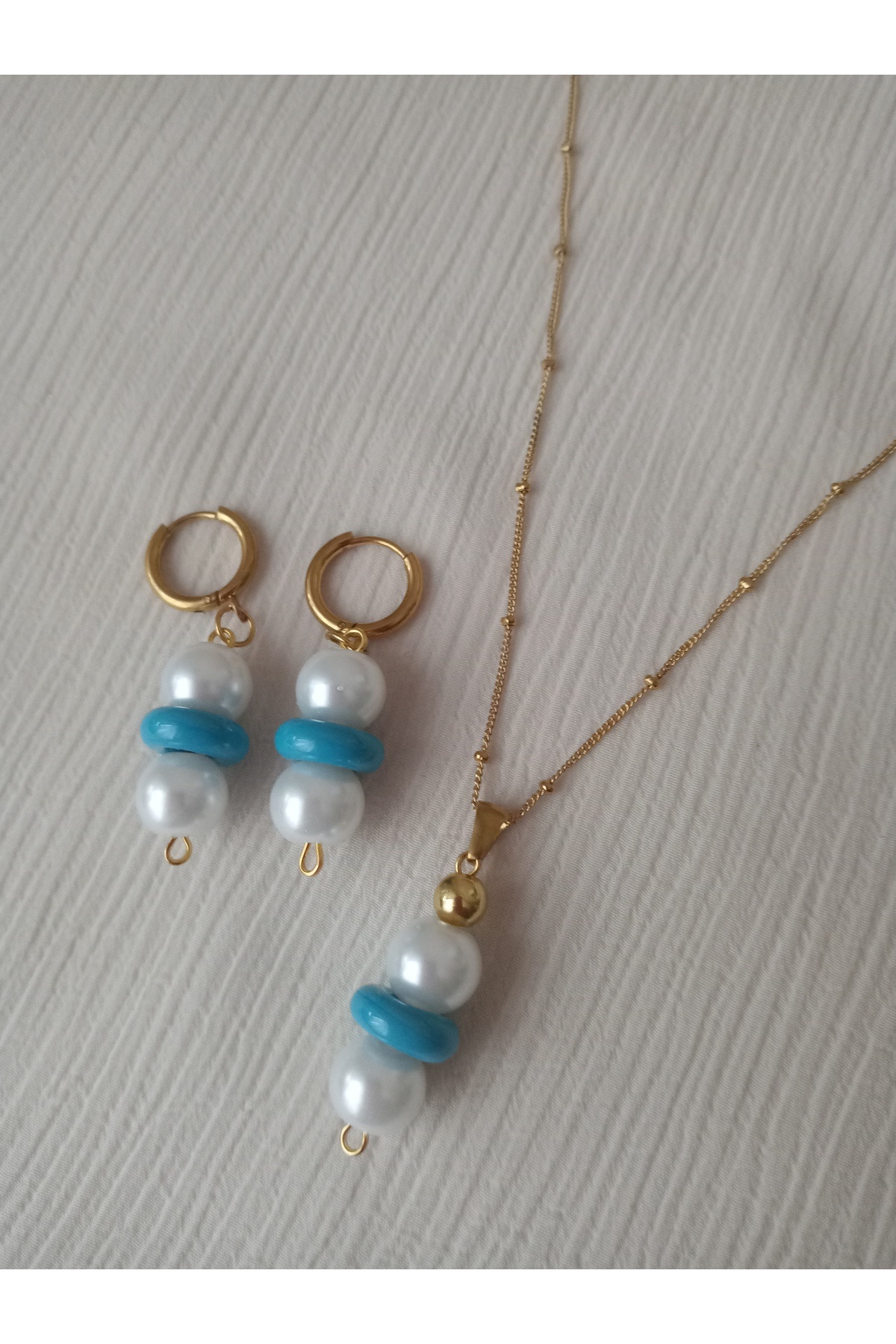 Çelik Set-Gold Topçuk 45cm kolye + uzatma ince zincirli + çelik halka klipsli küpe cam inci cam boncuk detaylı model.