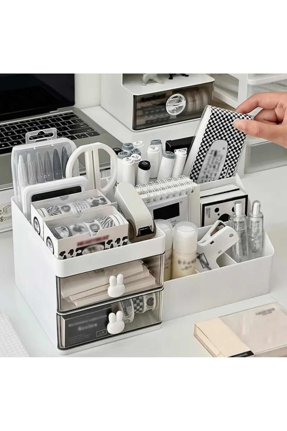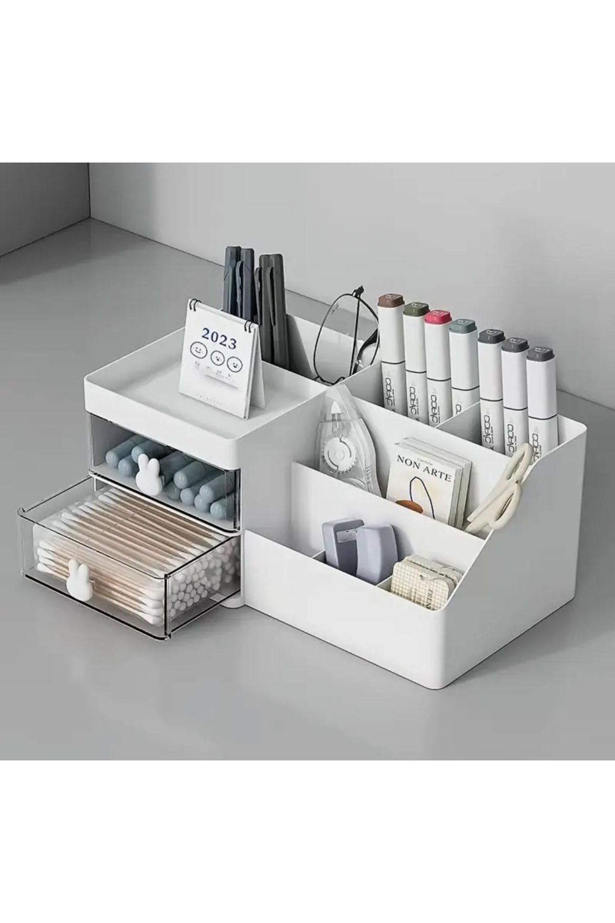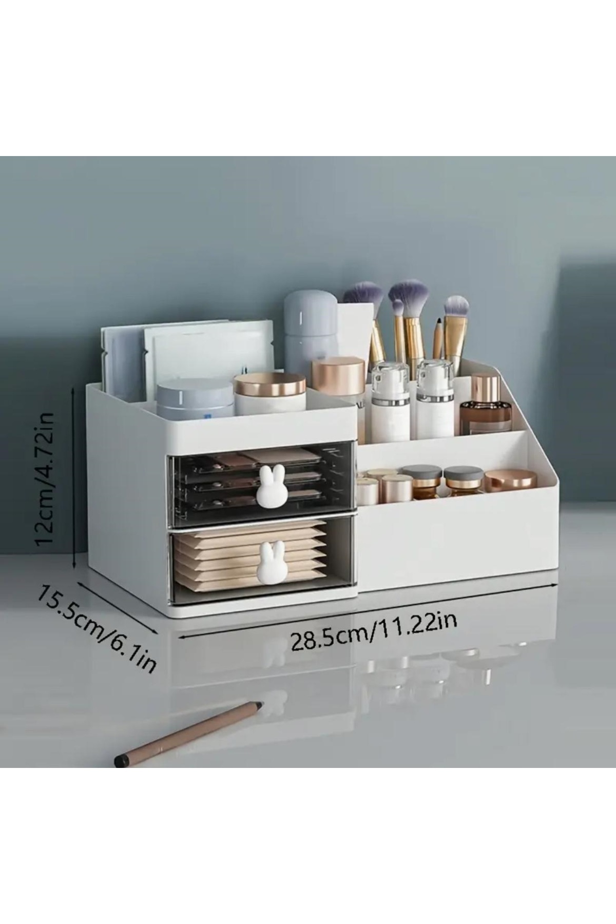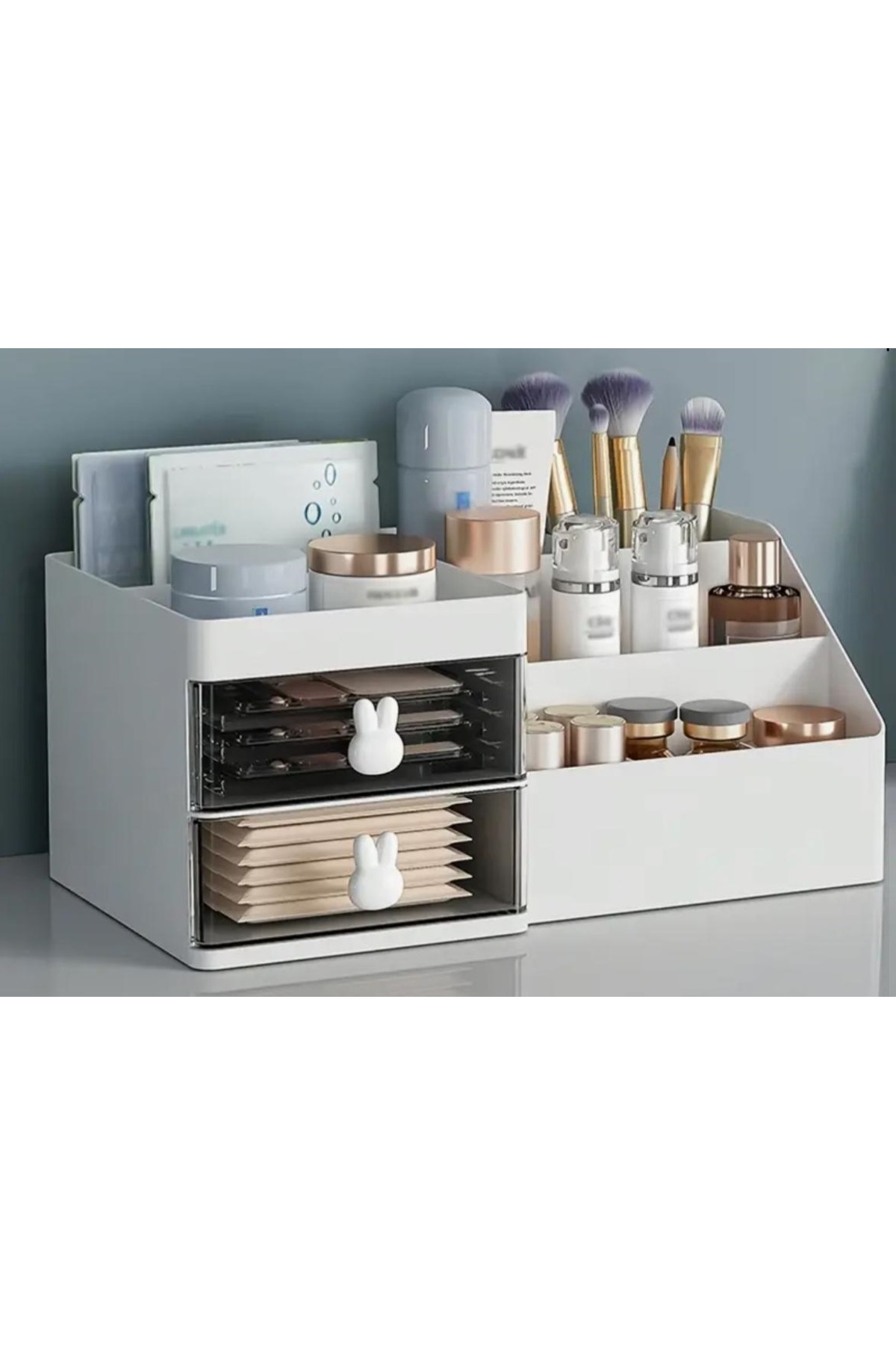 Özellikler: • Çok gözlü ve fonksiyonel tasarım • Çekmeceli alt bölme • Makyaj fırçaları için özel dikey alan • Serum, krem ve losyon şişeleri için geniş kullanım alanı • Takı ve küçük aksesuarlar için ideal • Dayanıklı PP plastik malzeme • Makyaj masası, banyo ve çalışma masasında kullanılabilir Kullanım Alanları: Makyaj masası, banyo dolabı, komodin, çalışma masası, kozmetik rafı.