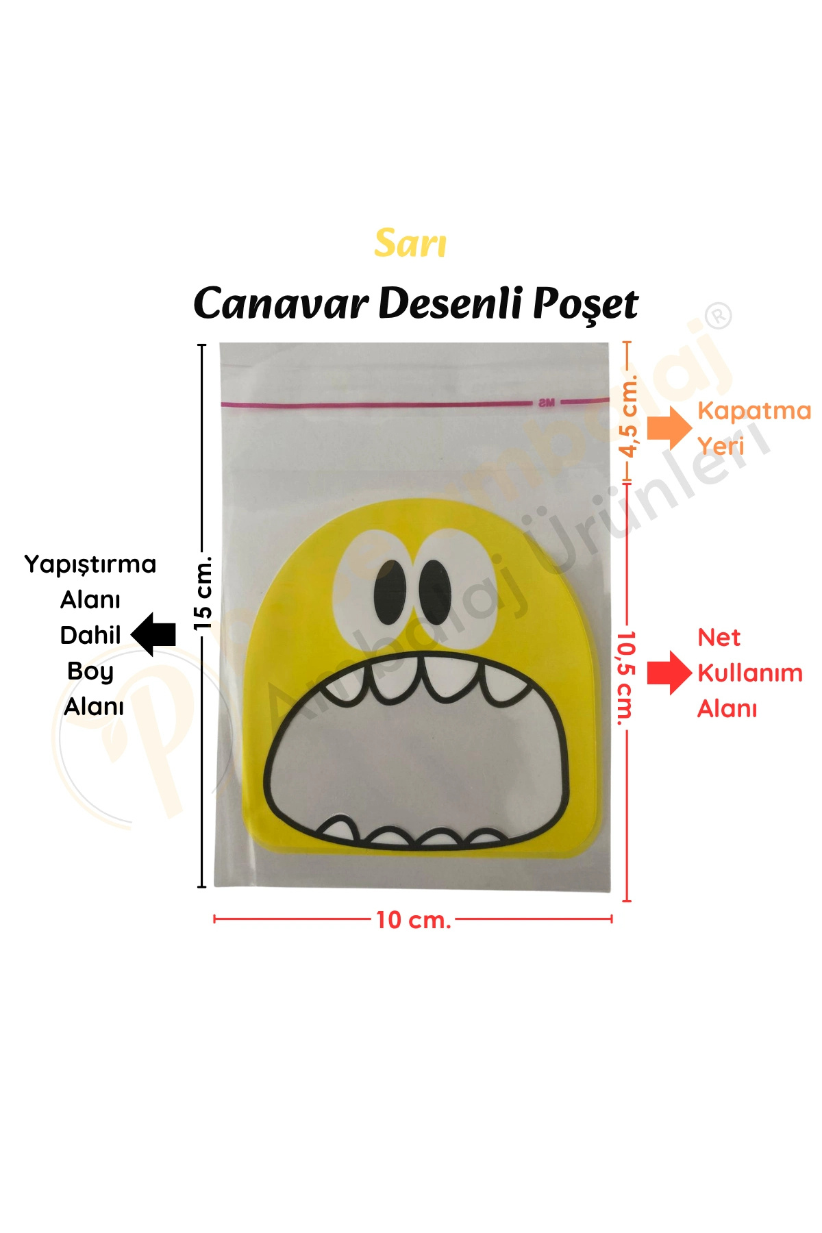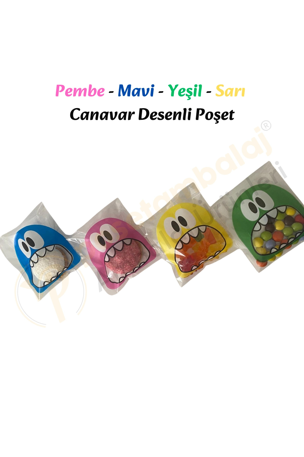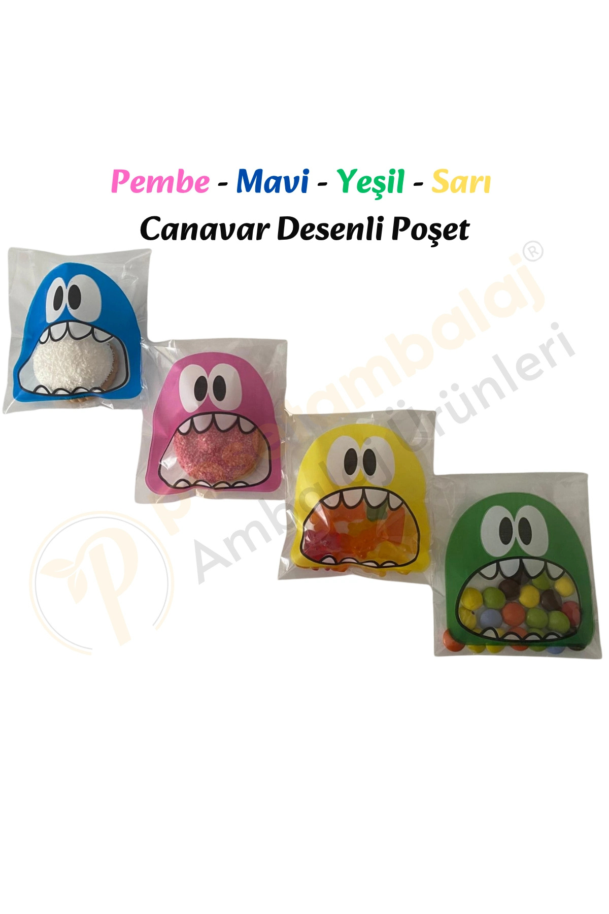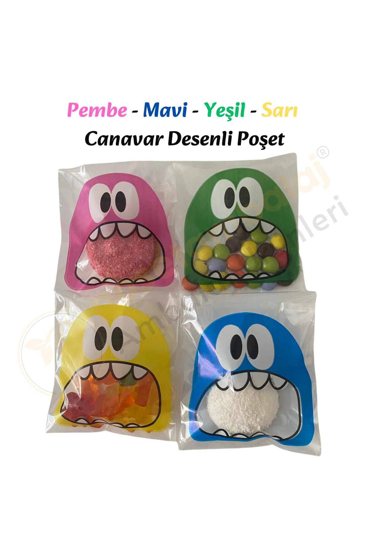 50 Adet 4 Renkli Canavar Desenli Cake Pop & Kurabiye Poşeti - 10x15 cm
