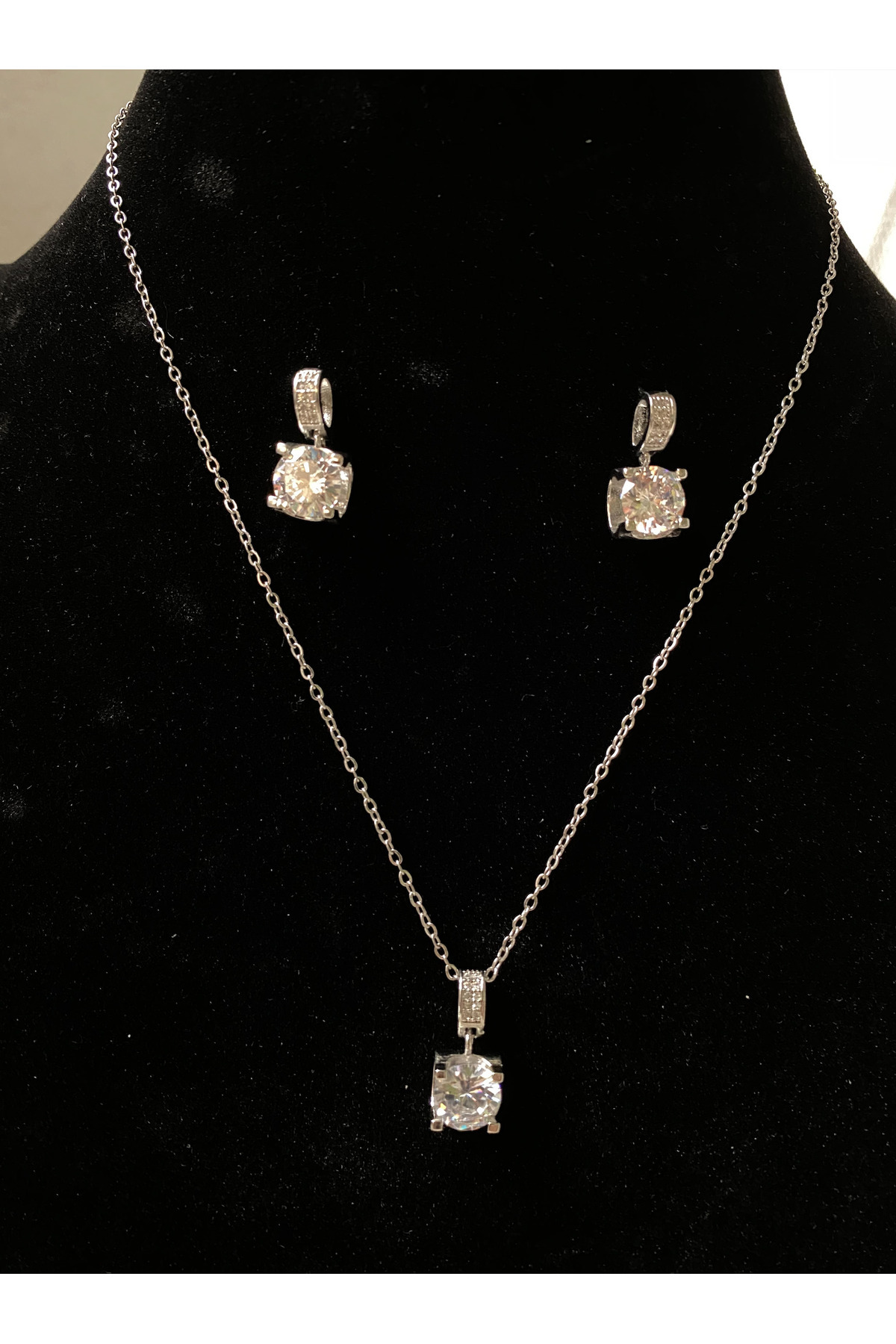 Premium Seri Zirkon Tek Taş Model Çelik Kadın Kolye Küpe Set