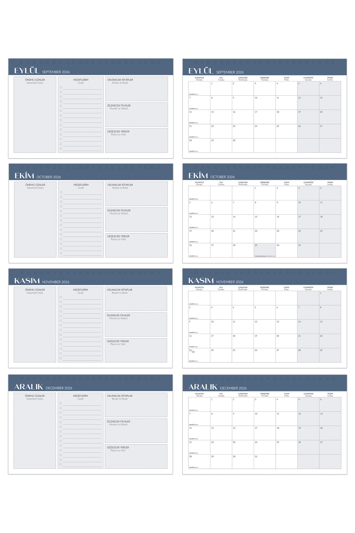 Aylık takvim sayfalarının arkasında yer alan özel planlama bölümleri