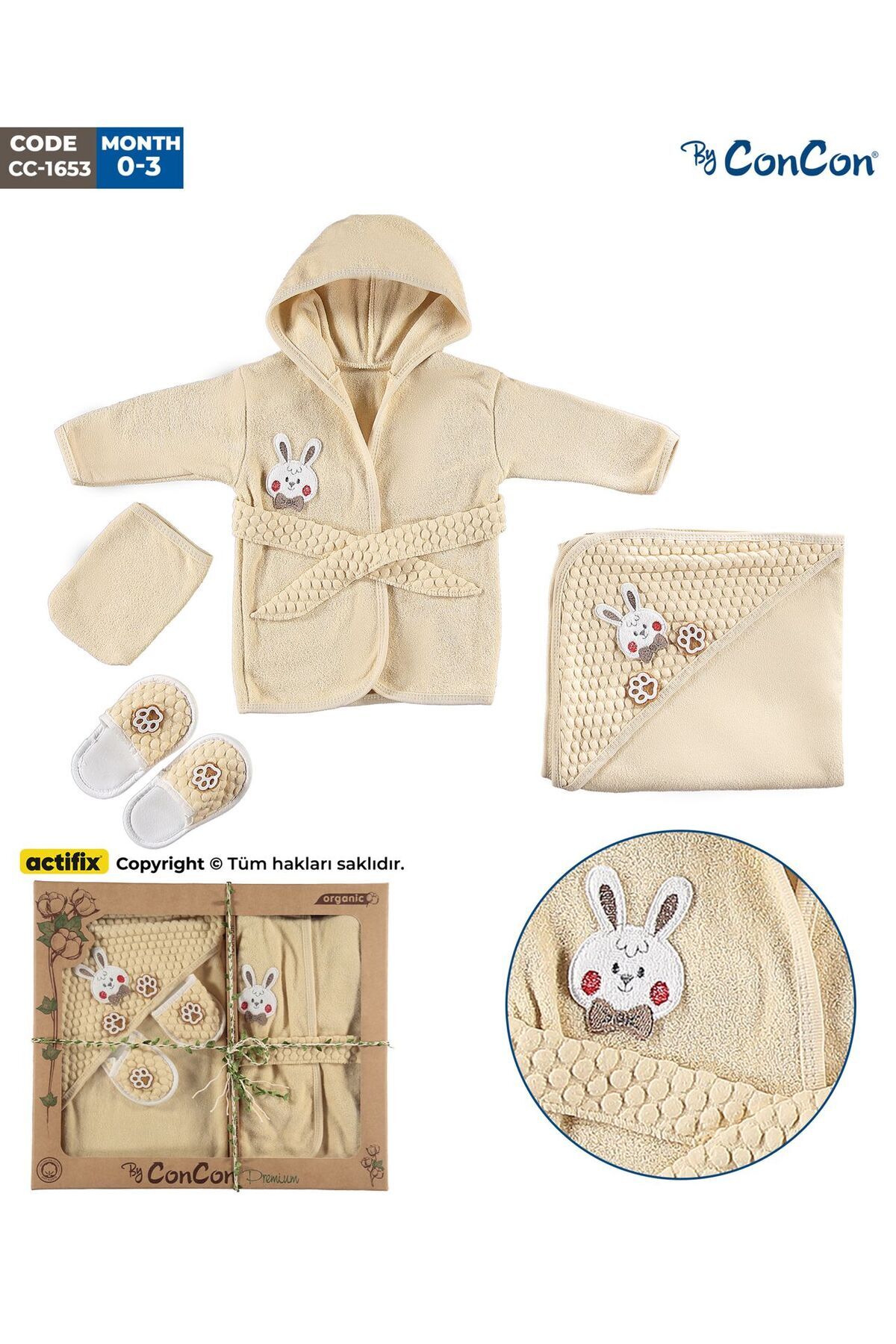 - 4 parça set halinde sunulan bu bornoz, bebeğinizin banyo sonrası rahatça kullanabileceği bir set oluşturur.