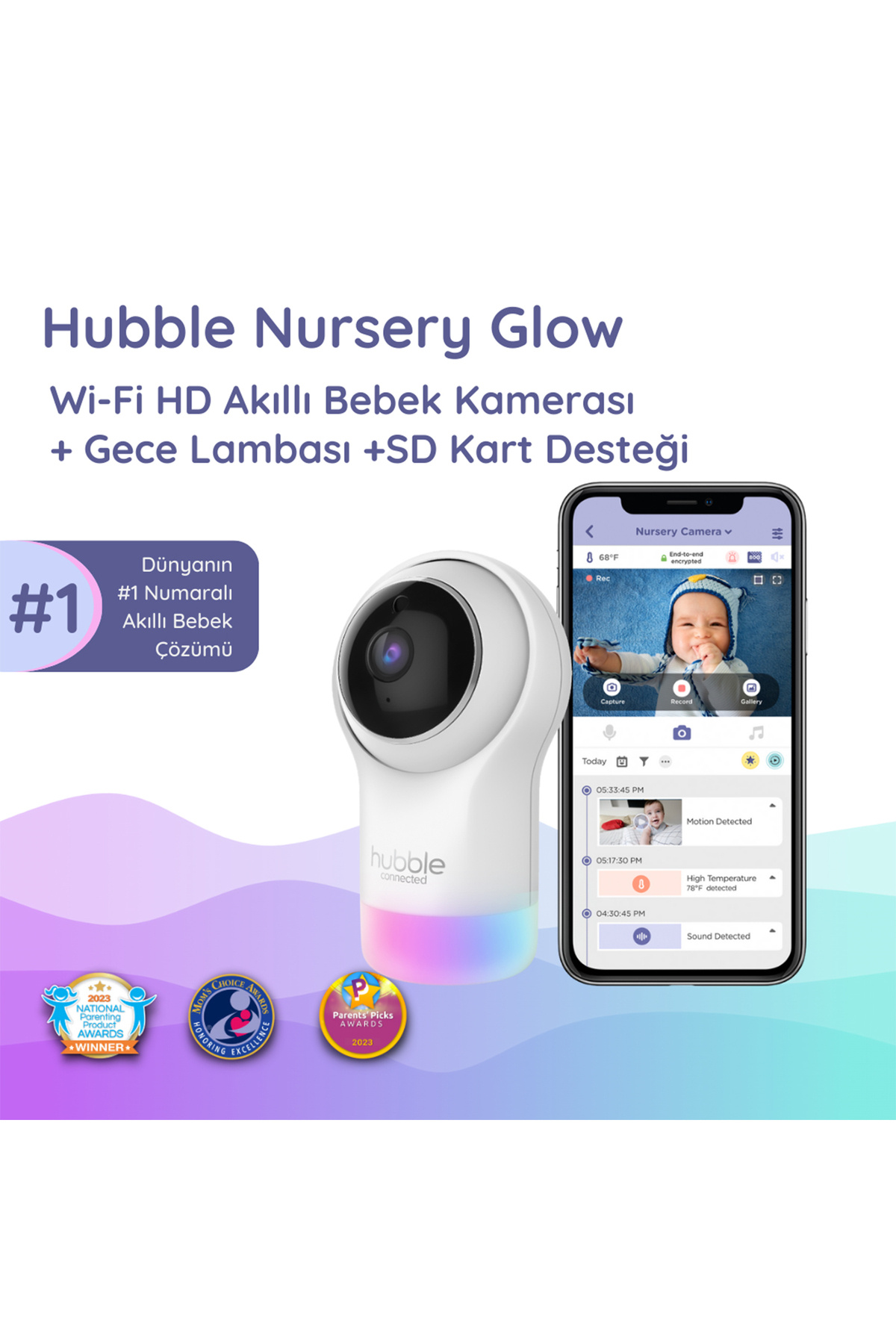 Hubble Nursery Glow SD Wi-Fi Dijital Bebek Kamerası + Gece Lambası + SD Kart Desteği Bir bebek kamerasından çok daha fazla özellik sunan yenilikçi bebek izleme sistemi Hubble Connected Nursery Pal Glow ile tanışın! Akıllı cihazlarınızdan 1080p Full HD görüntü kalitesiyle bebeğinizi dilediğiniz zaman izleyebilirsiniz Kamerayı uzaktan aşağı-yuları, sağa-sola hareket ettirerek ve yakınlaştırma özelliğini kullanarak istediğiniz detayda görüntü alabilirsiniz Kamerada bulunan 7 farklı renkteki gece lambası ve Uyku Eğitmeni uygulamasıyla uykusuz geceler geçmişte kalır Önceden yüklenmiş doğa sesleri, ninniler ve sesli kitaplar ile bebeğinizi uyutmak artık çok daha kolay Dijital kaydırma ve yakınlaştırma özellikleriyle kamerayı kontrol ederek bebeğinizin odasındaki her bir detayı izleyebilirsiniz Tüm Özellikler • Kamerayı aşağı yukarı, sağa sola hareket ettirebilme ve yakınlaştırma • 7 Farklı Renkti Gece Lambası • Uyku Eğitmeni • Gizli ve Güvenli Wi-Fi Bağlantı • Oda Isısı Sensörü • Yüksek Hassasiyetli Mikrofon • Akıllı Cihaz Üzerinden Full HD Canlı Yayın • Kızılötesi Gece Görüşü • SD Kart Desteği • Amazon Alexa ve Google Asistan ile Çalışır HubbleClub Uygulaması ile