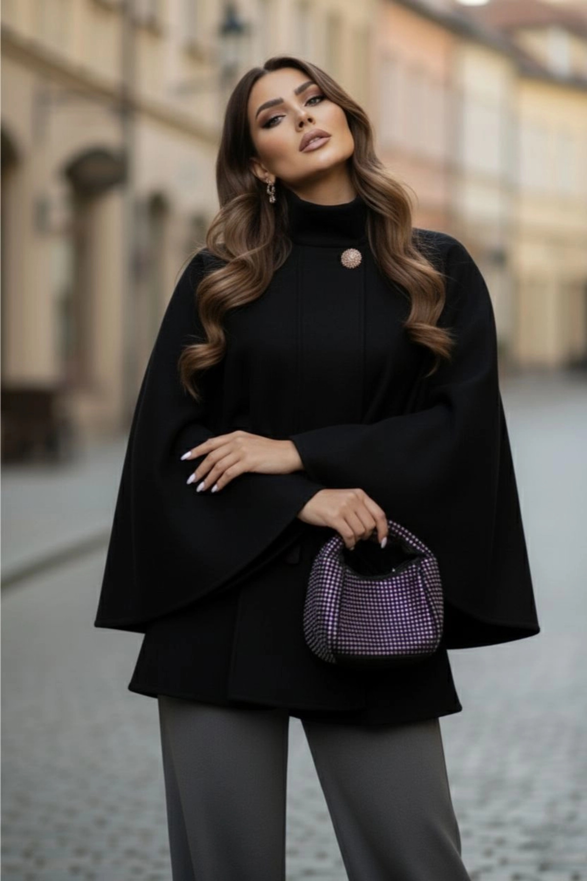 Gold Detaylı Kaşe Pelerin Panço 6100