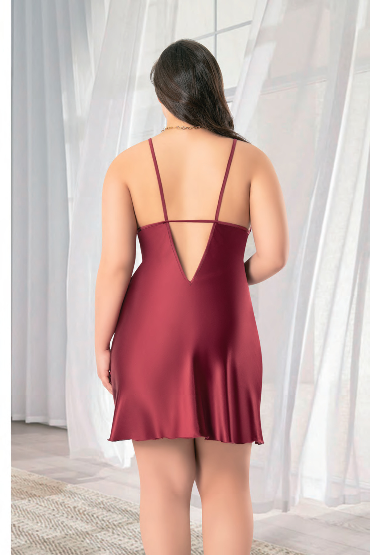 Büyük Beden Fiyonk Detaylı Dantelli Saten Gecelik – Bordo