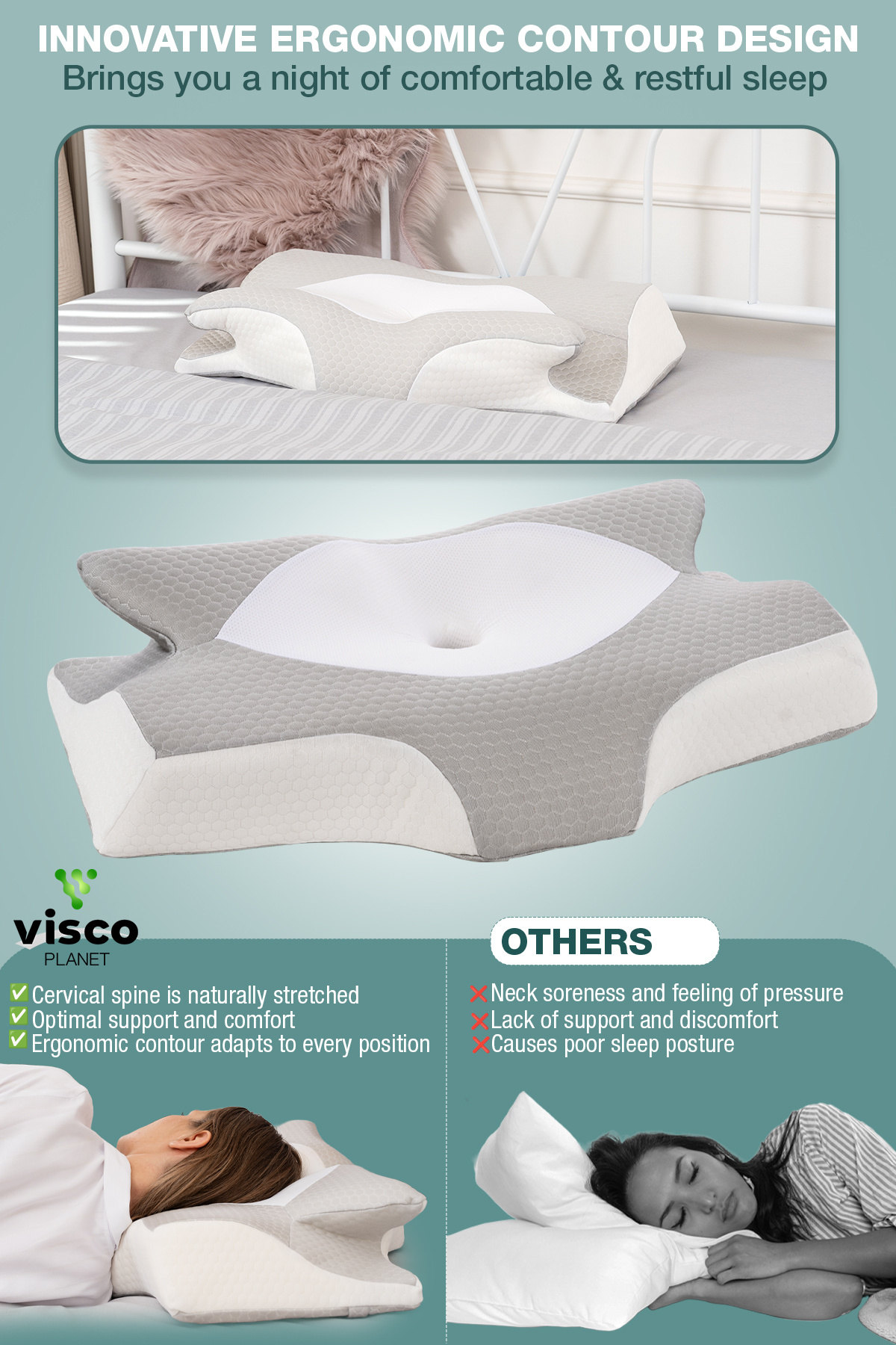 SAĞLIKLI UYKU İÇİN PRİMİUM ORTOPEDİK VİSCO YASTIK Standart destek yastıklarının %90’ından farklı olarak Visco Planet, yüksek yoğunluklu 3D nefes alan örgü kumaş kılıfı sayesinde hava dolaşımını maksimum düzeye çıkarır.