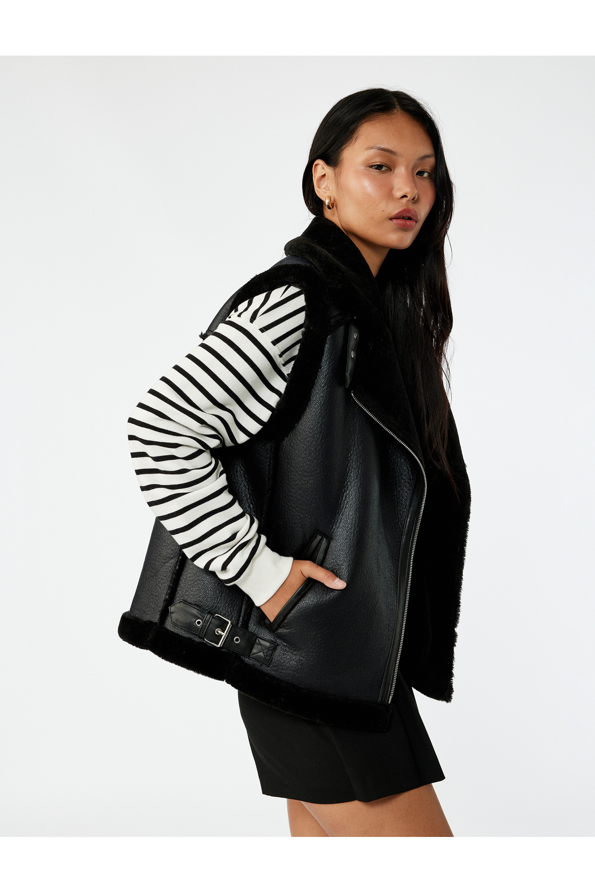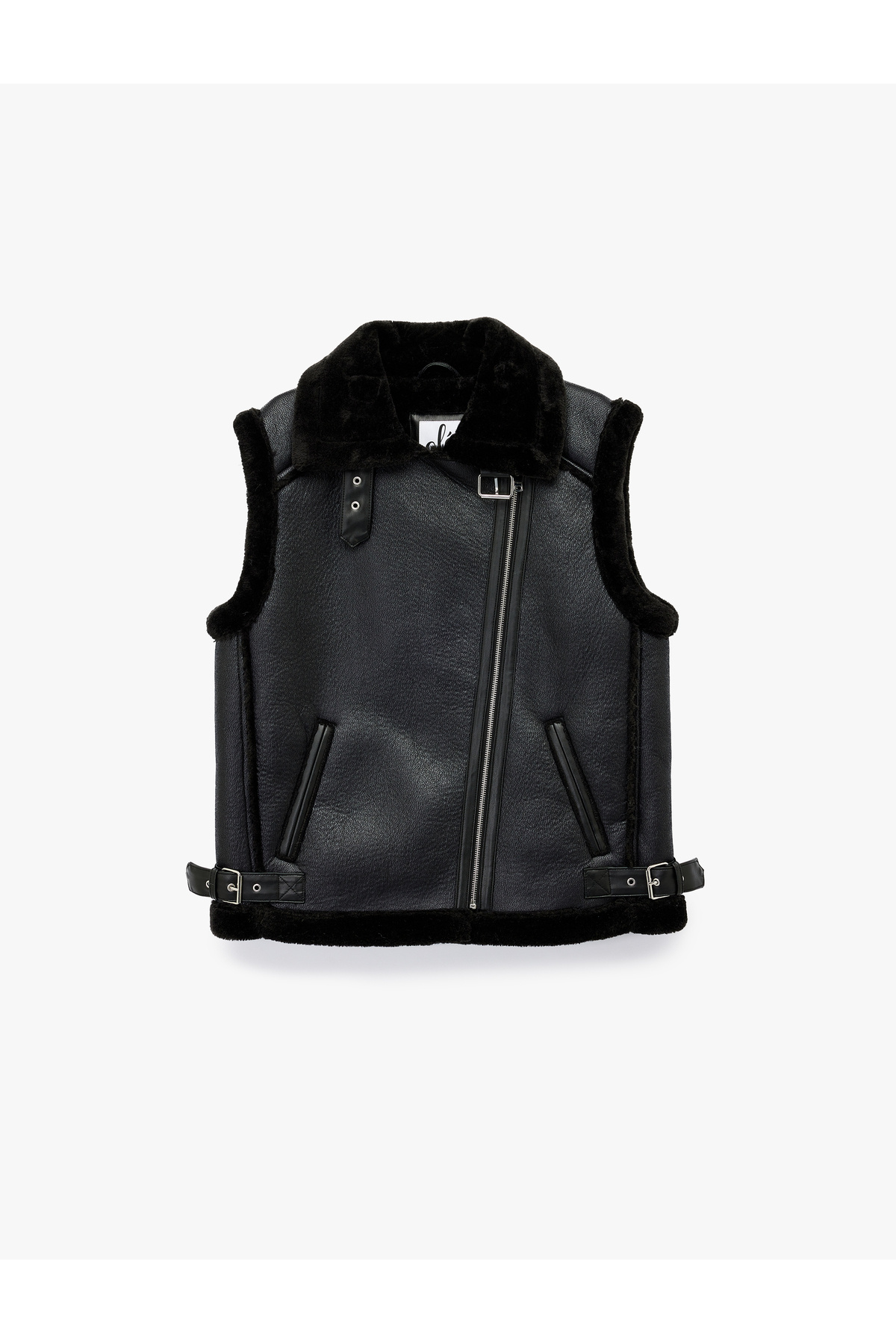 Suni Kürklü Yaka Fermuarlı Deri Görünümlü Kolsuz Biker Yelek