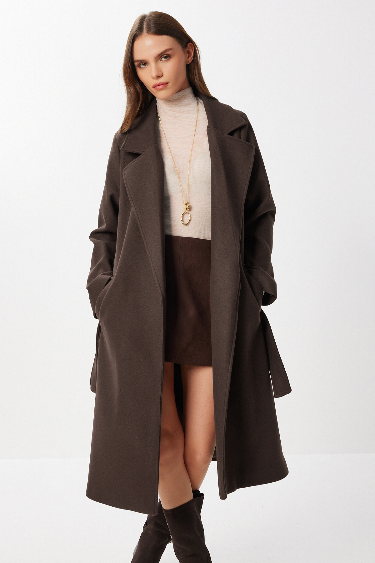 Kruvaze yaka, astarlı, yan cepli, kuşaklı, uzun kaşe kabanİçerik: %73 Akrilik %23 Polyester %4 DiğerÜrün Boyu: 110 cm Kol Boyu: 59 cm30° makinede yıkanabilir.