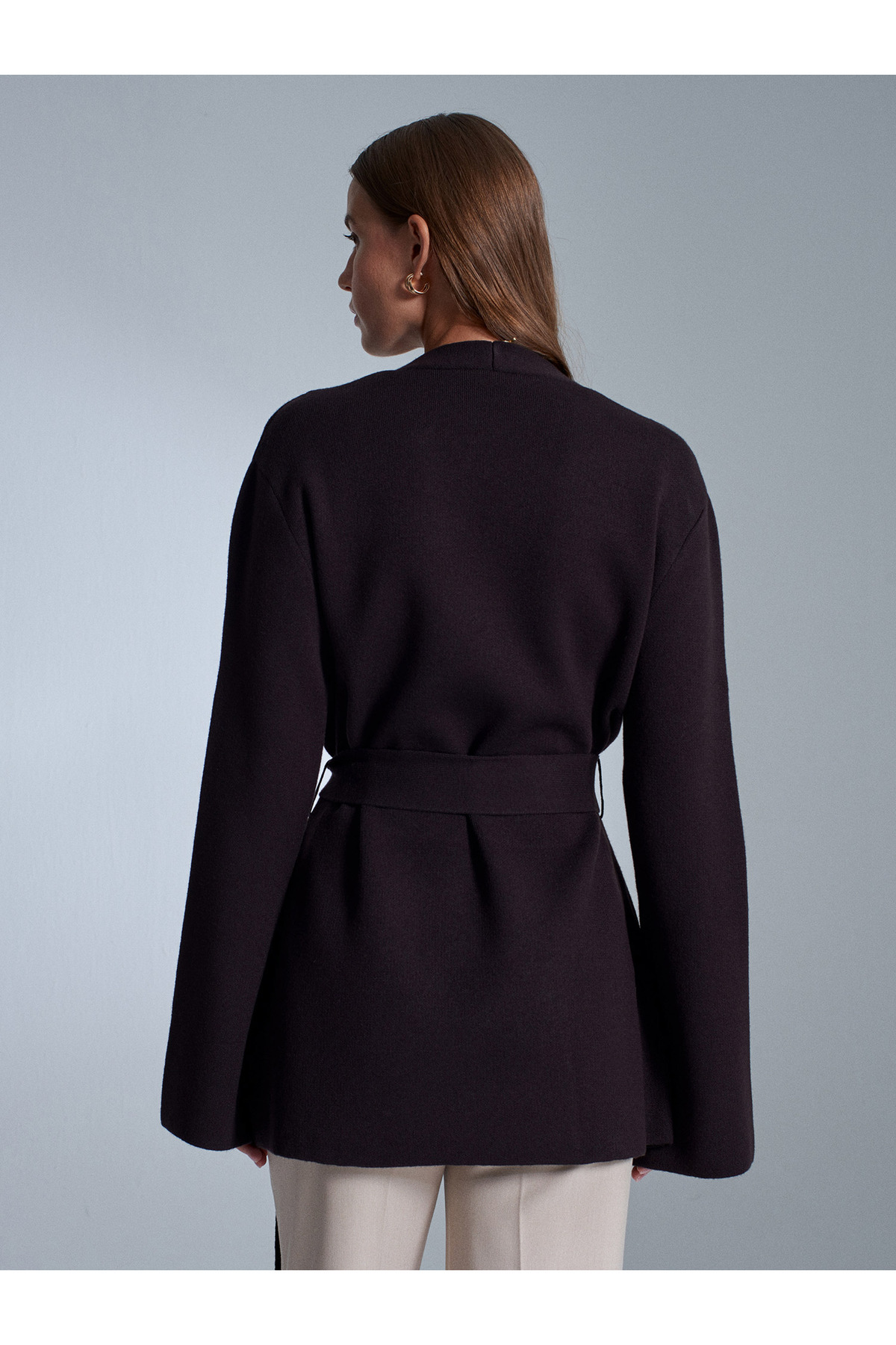 61002 Kruvaze Kemerli Yün Karışımlı Triko Hırka-Koyu Kahve