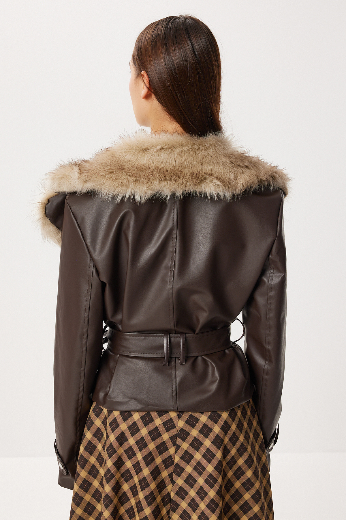 Kürk yakalı, astarlı, kapaklı cepli, kuşaklı suni deri ceketİçerik: %100 Poliüretan Ürün Boyu: 57 cm Kol Boyu: 62 cm Yıkamayınız.