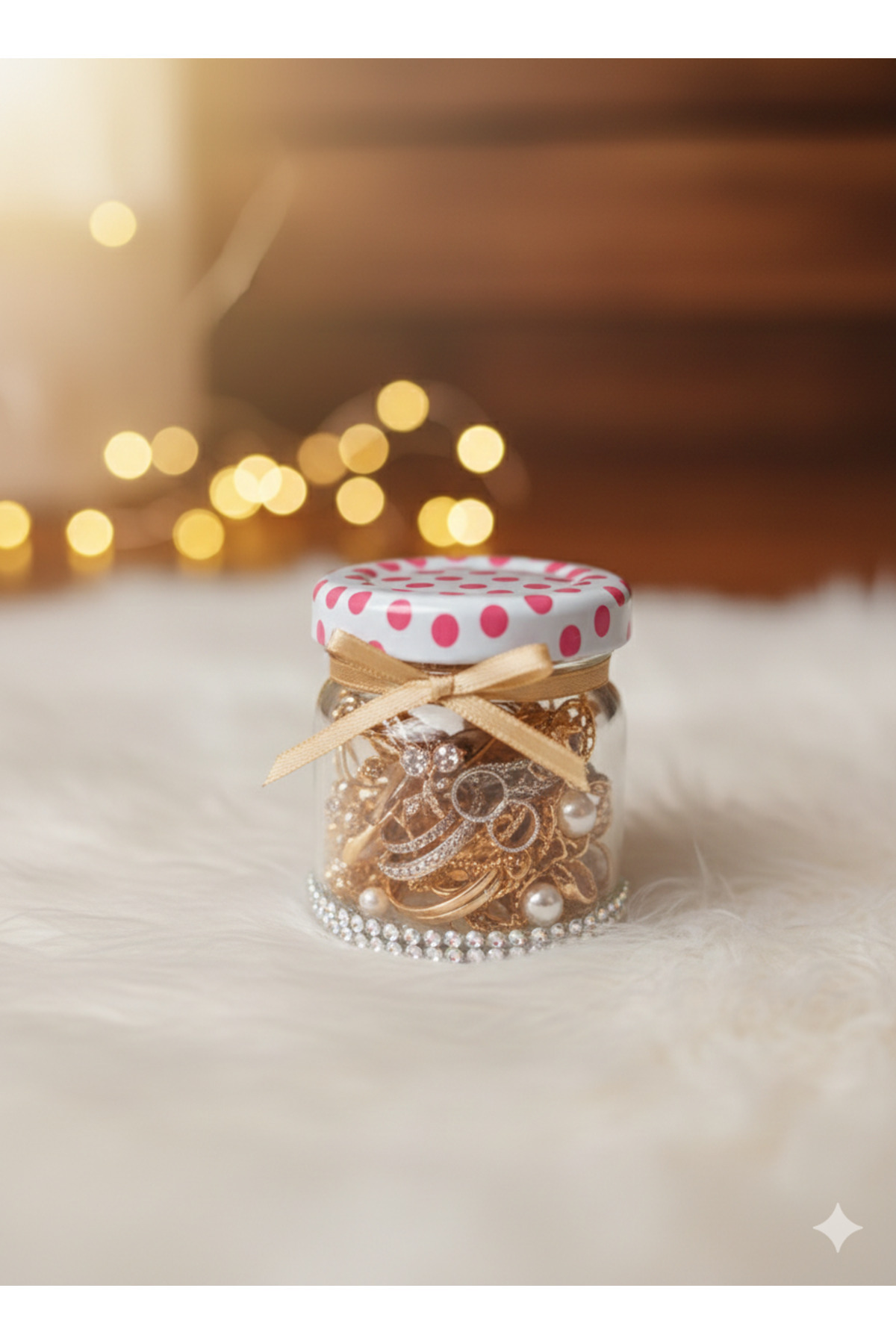- Cam taş detayı ile göz alıcı bir görünüm kazanan bu takı kavanozu, her türlü takınız için ideal bir saklama çözümü sunar.