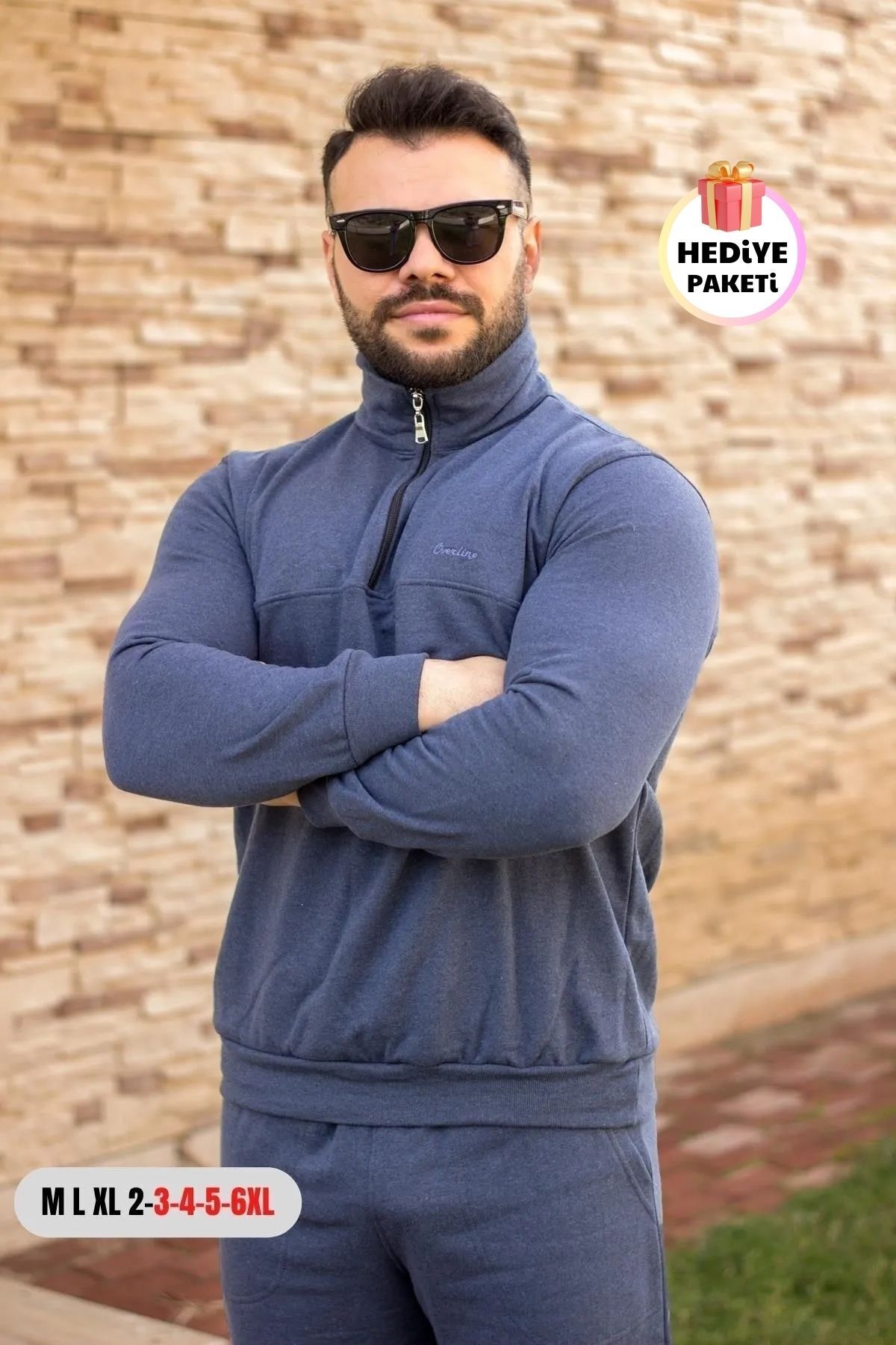 Koyu Gri Battal Büyük - Normal Beden Bol Paça Yarım Fermuarlı Pamuklu Erkek Eşofman Takımı 21eestyak