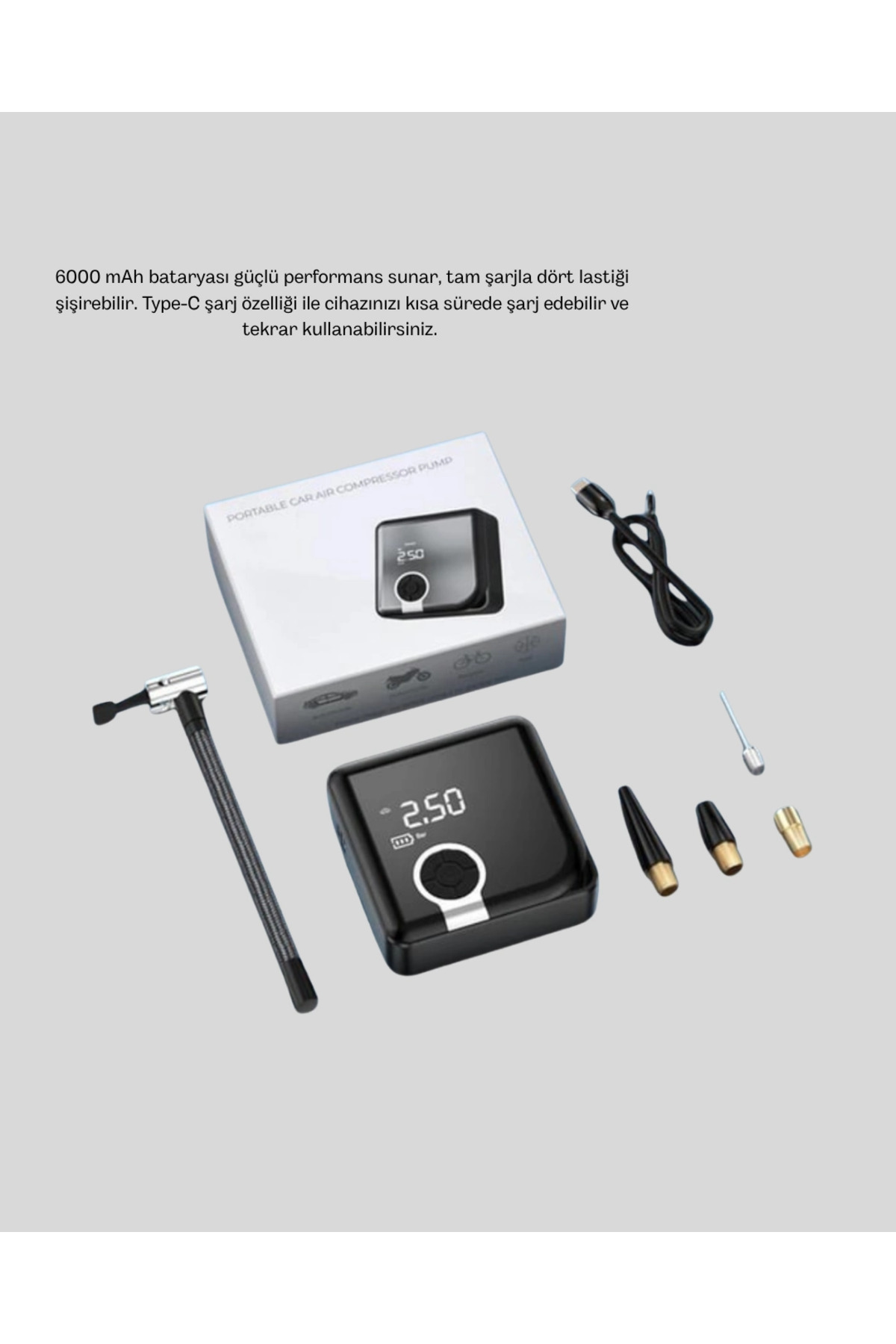 Bu durum hem lastiğin fazla şişmesini engeller hem de cihazın uzun ömürlü kullanımına katkı sağlar.6000 mAh batarya kapasitesi, cihazın tek şarjla dört lastiği şişirebilmesini mümkün kılar.