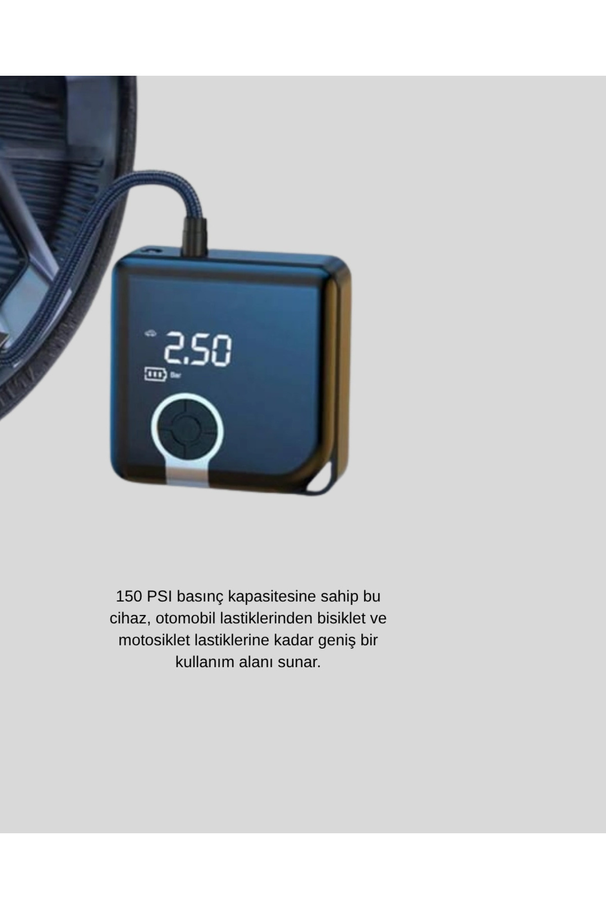 150 PSI’a kadar ulaşan yüksek basınç kapasitesi ile otomobil, motosiklet ve bisiklet lastiklerinin yanı sıra spor topları, deniz ürünleri, şişme yataklar ve kamp ekipmanları gibi birçok ürünü şişirmeye uygundur.