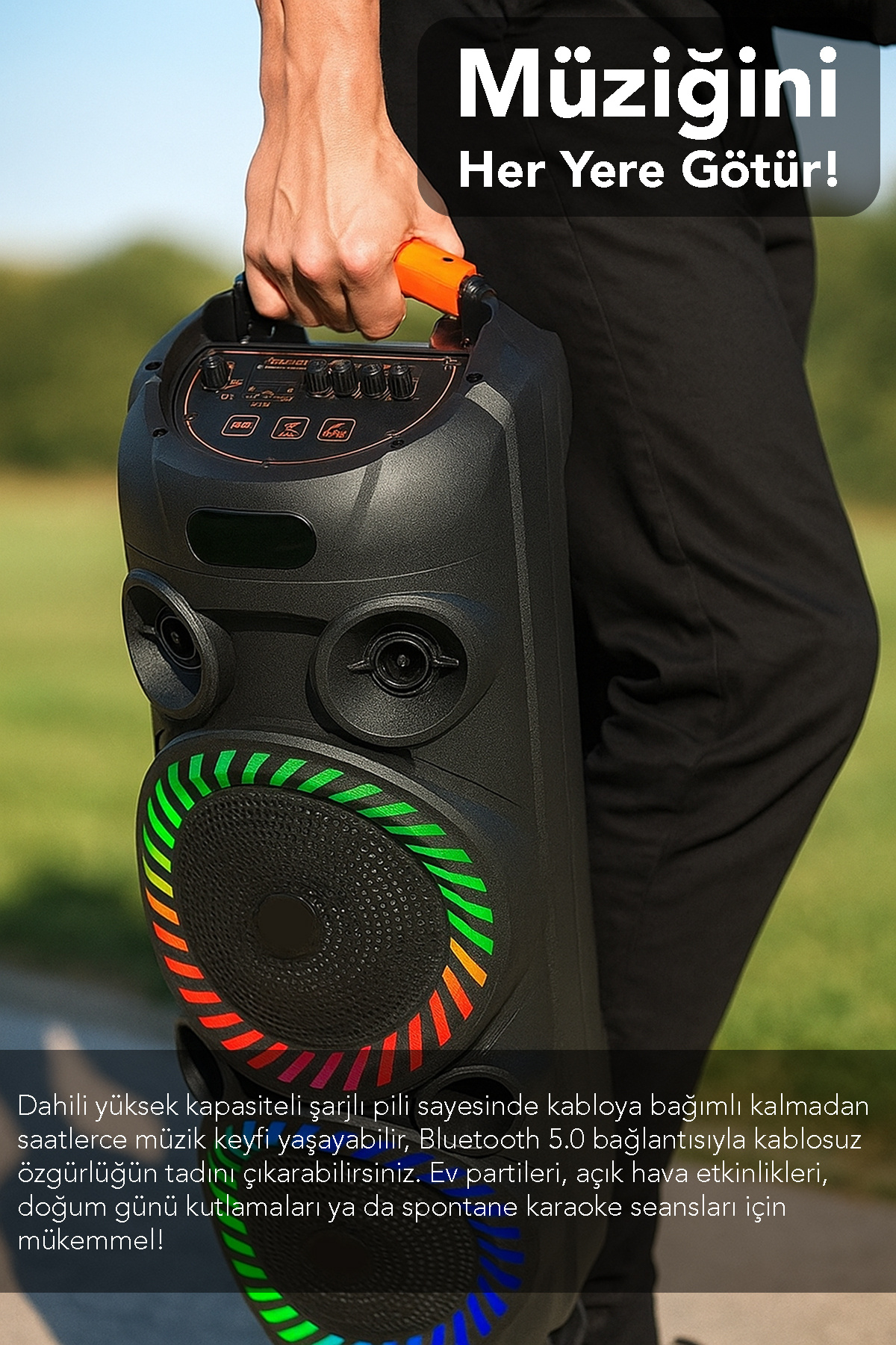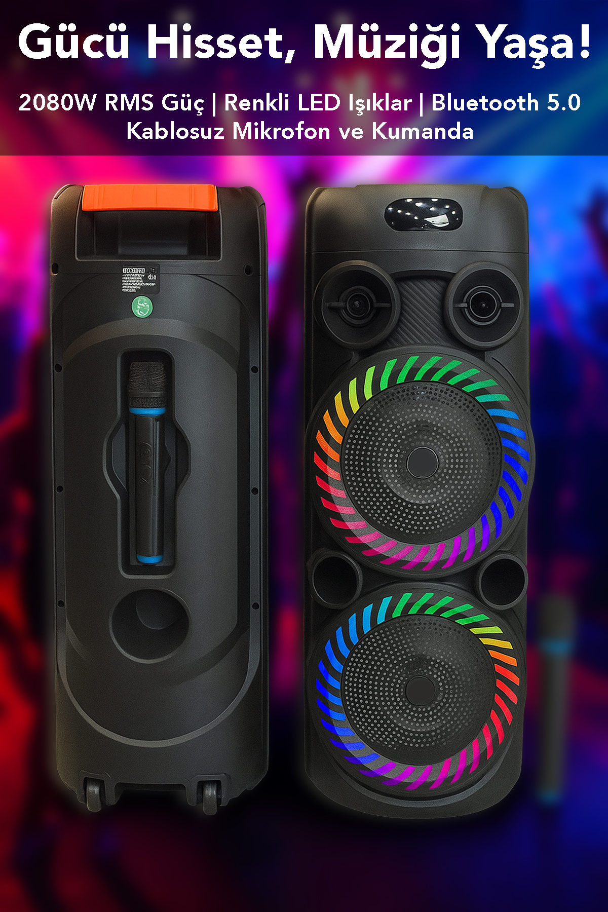 Işıklı tasarımı, ortamın enerjisini artırır ve parti hoparlörü olarak ideal bir atmosfer oluşturur.