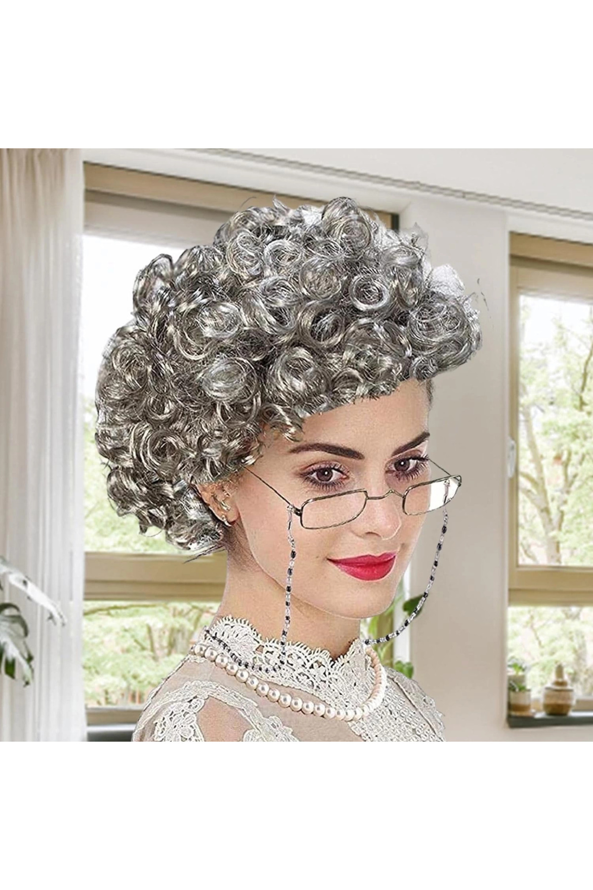 Gri Renk Kıvırcık Yaşlı Peruk Büyükanne Peruğu Astarlı Bonus