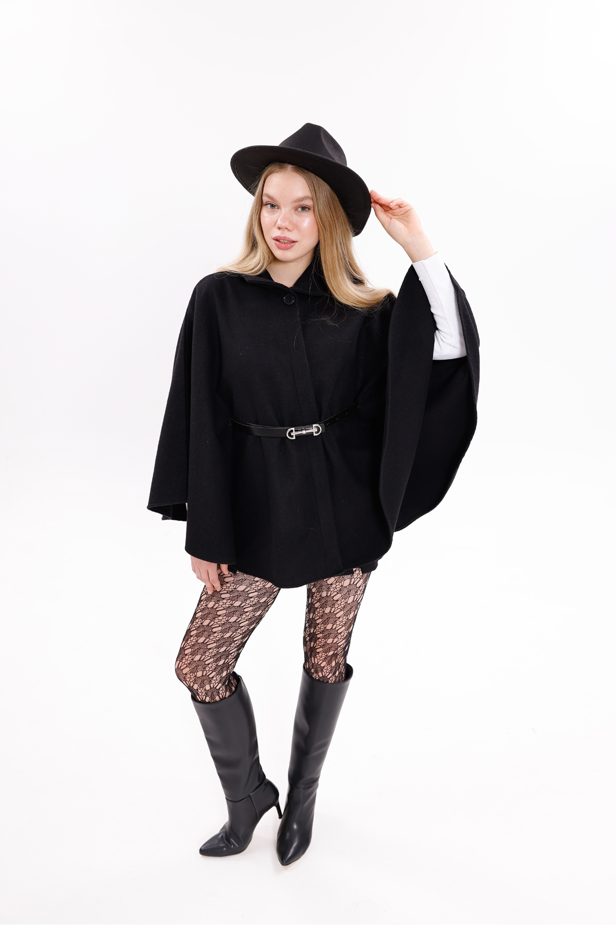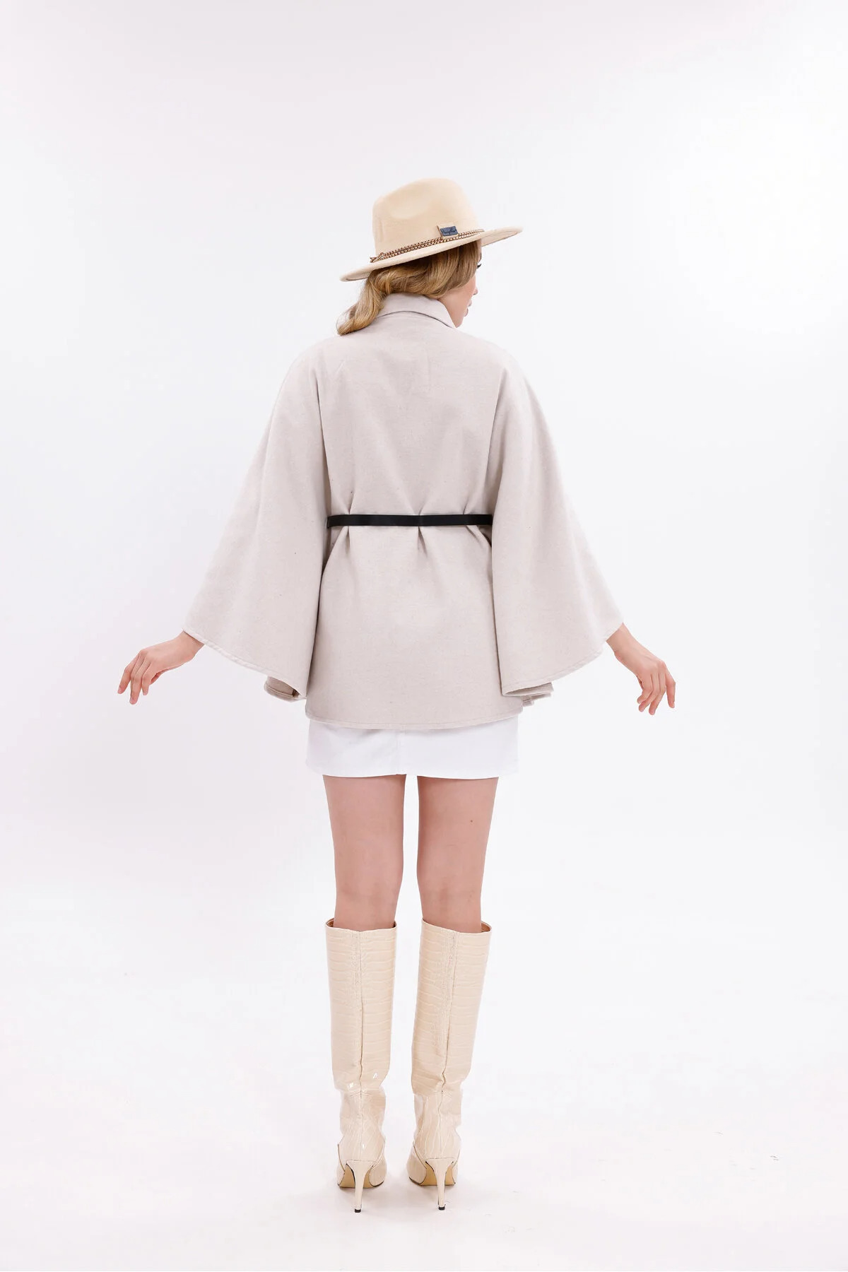 Yeni Sezon Bej Tesettür Kemerli Kaşe Panço – Modern ve Zarif Kışlık Model