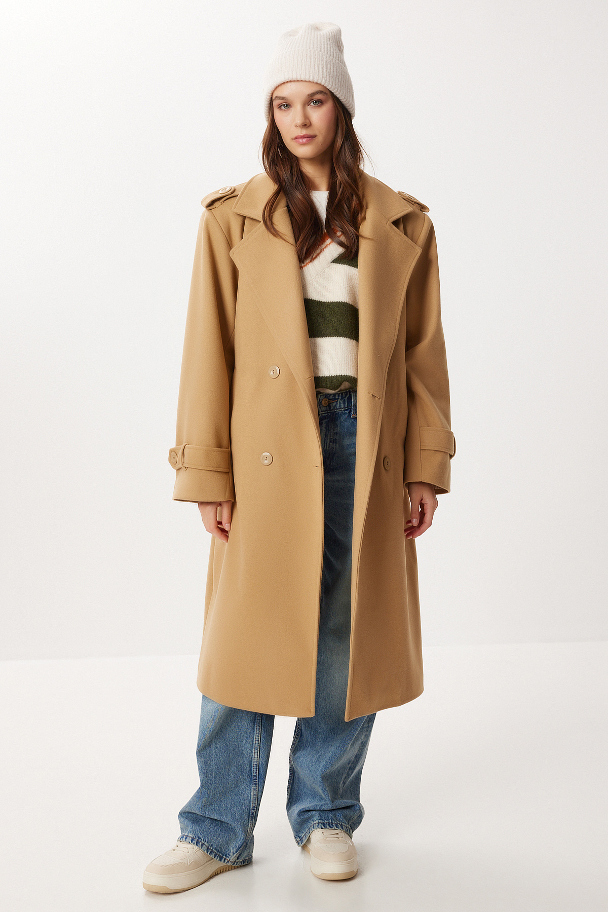 Kruvaze yaka, kuşaklı, düğme kapamalı, astarlı, yan cepli, omzu ve kol ucu düğmeli, kuşaklı kaşe kabanİçerik: %100 PolyesterÜrün Boyu: 108 cm Kol Boyu: 60 cm 30° makinede yıkanabilir.