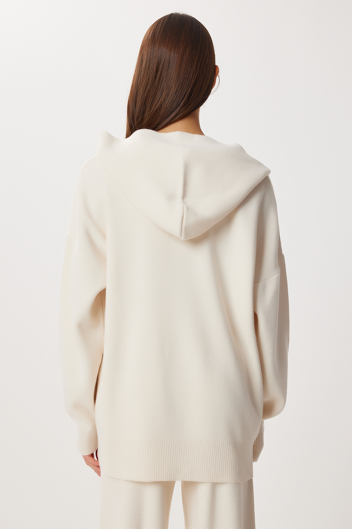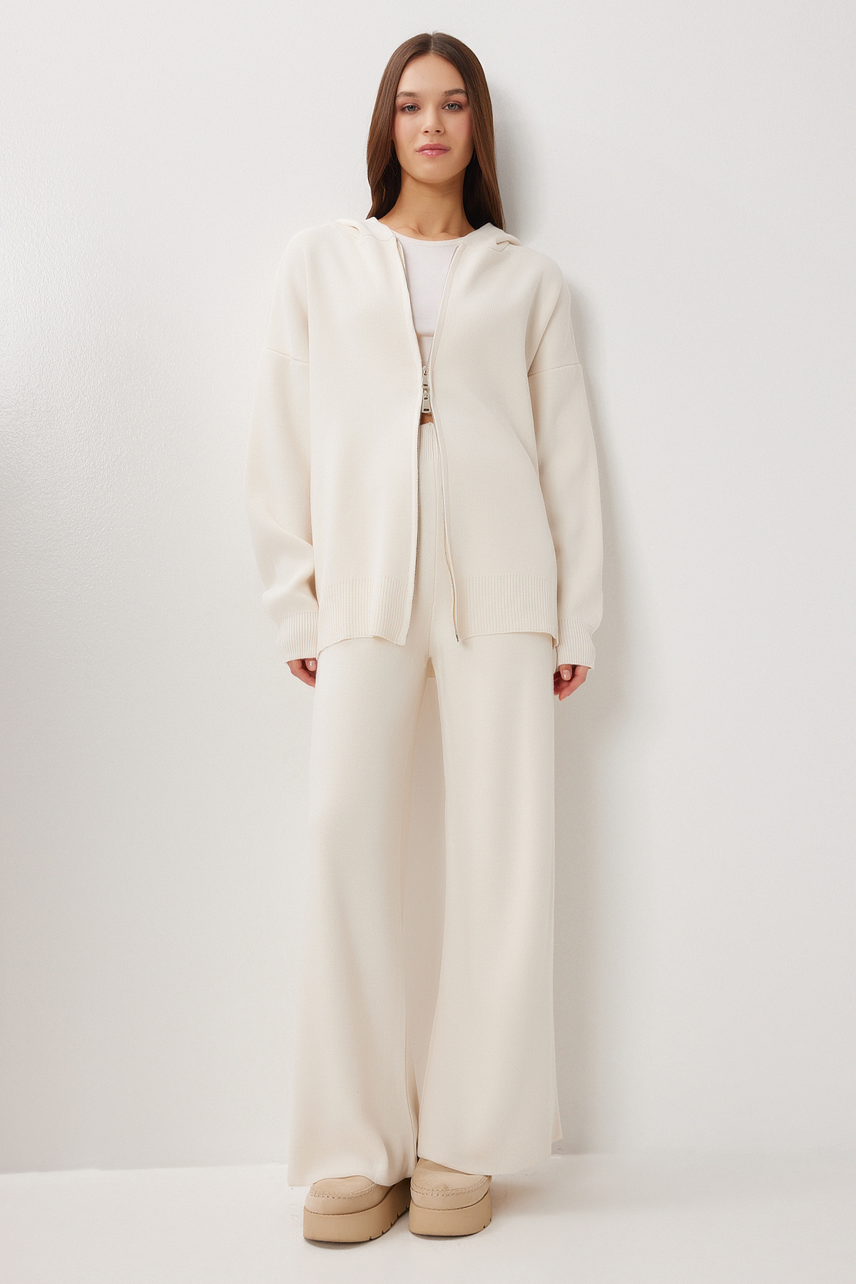 Kapüşonlu, fermuar kapamalı, düşük omuzlu hırka ve elastik bel, cepsiz, geniş paça pantolondan oluşan triko takımİçerik: %100 AkrilikHırka Boyu: 68 cm Kol Boyu: 49 cm Pantolon Boyu: 103 cm 30° makinede yıkanabilir.