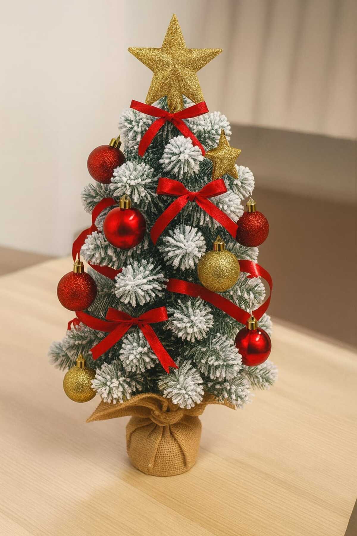 - 40 cm boyutunda, masa üstü kullanım için ideal bir noel ağacı ve süs malzemeleri seti.