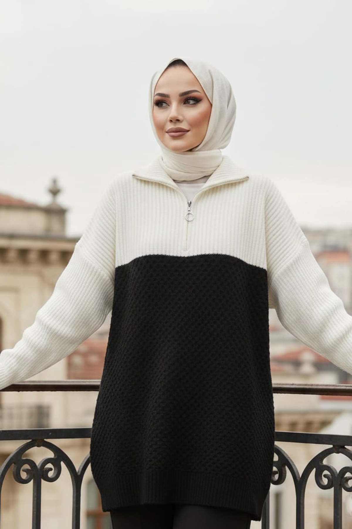 Blok Renkli Çağla Yeşili Tesettür Triko Kazak Tunik 87501CY