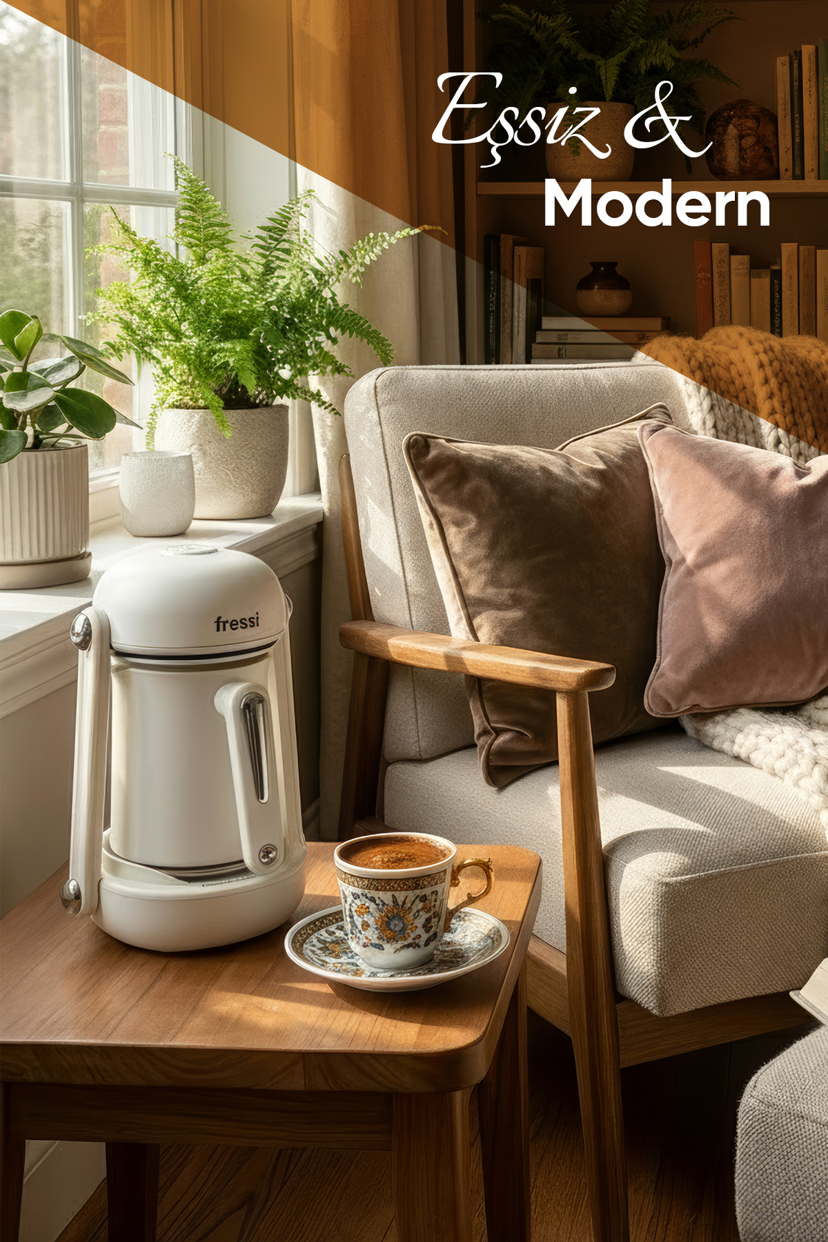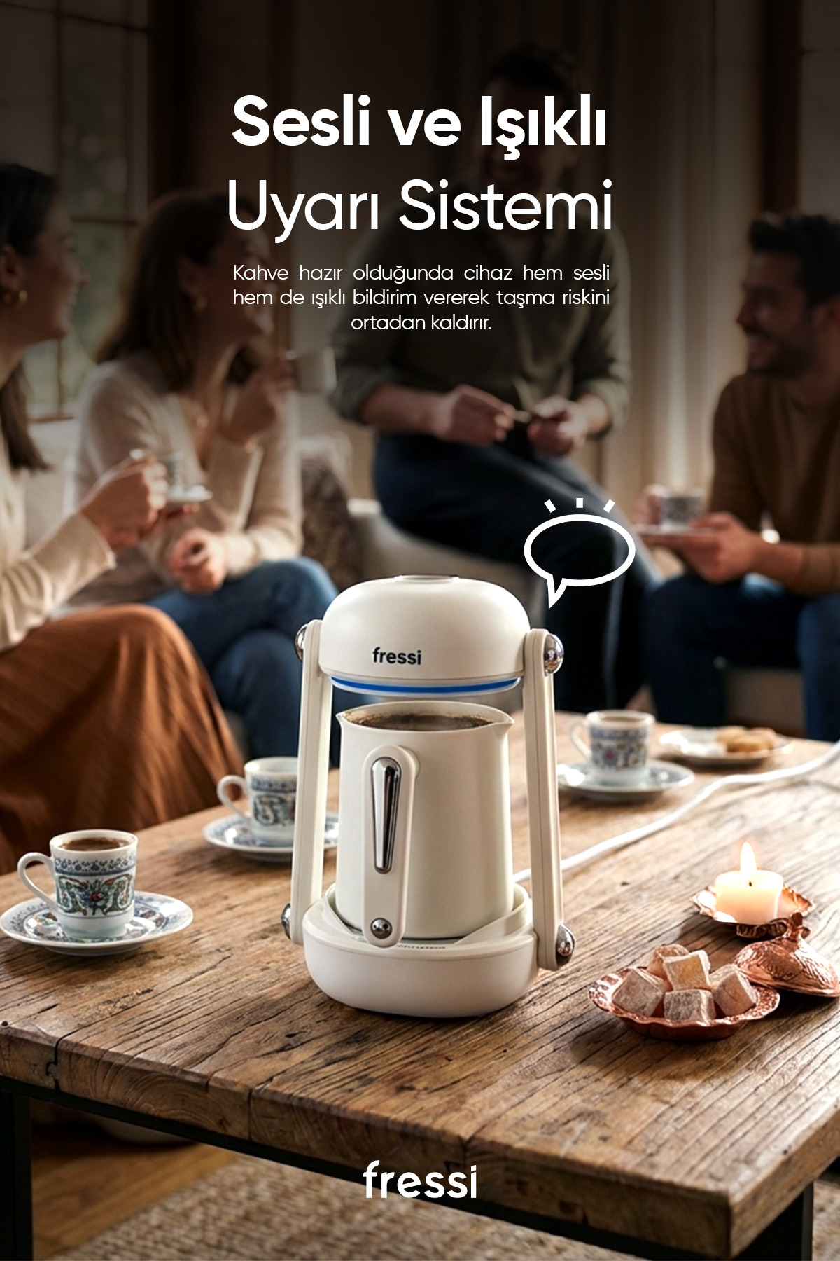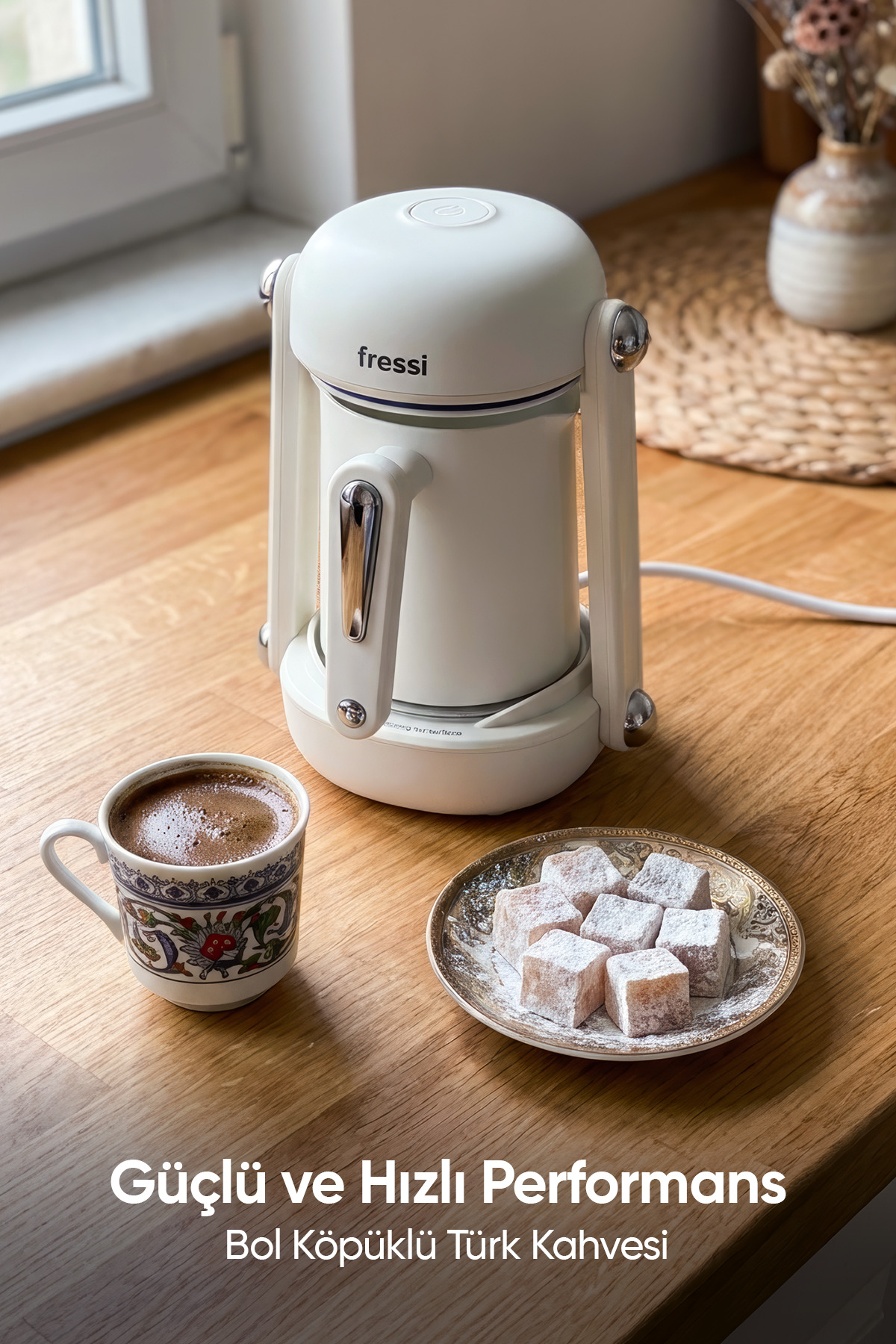 Fressi FR-TK205 İmpera Türk Kahve Makinesi, şık tasarımı ve kompakt yapısıyla mutfağınıza modern bir dokunuş katarken, bol köpüklü Türk kahvesini zahmetsizce hazırlamanıza yardımcı olur. 1–4 fincan kahve kapasitesiyle hem tek içimler hem de misafir ikramları için idealdir. Beyaz, krem, siyah ve yeşil renk seçenekleriyle mutfağınızın tarzına uyum sağlar. 650 W gücü sayesinde kahvenizi hızlıca pişirir, pişirme bittiğinde ise ışık ve ses uyarısıyla sizi bilgilendirir.