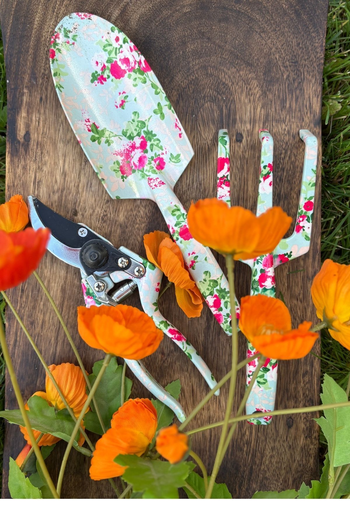 3lü Pastel Çiçek Desenli Bahçe Aletleri Seti, Floral Çiçekli Kürek, Budama Makası, El Tırmığı