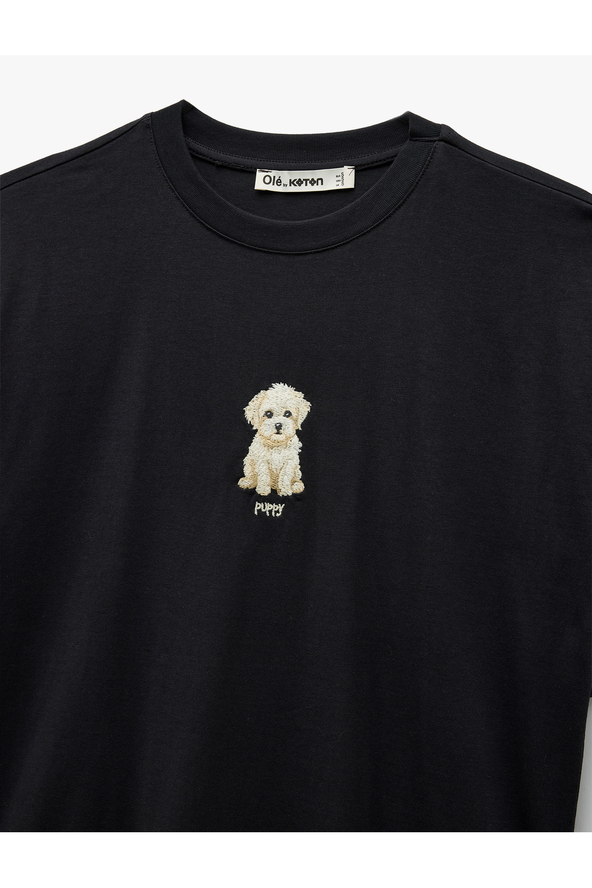 Bisiklet Yaka Kısa Kollu Köpek Nakışlı Pamuklu Oversize Tişört