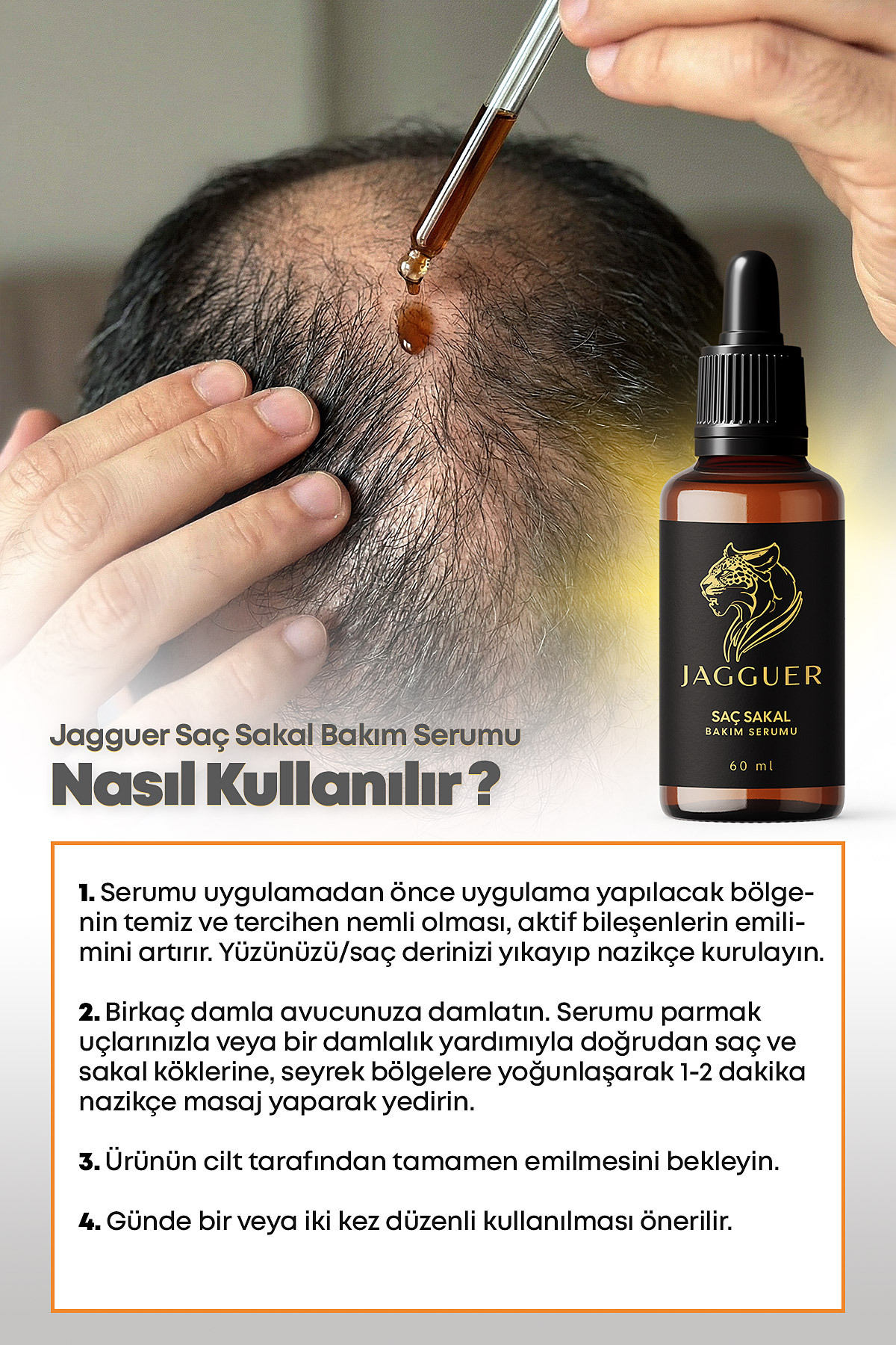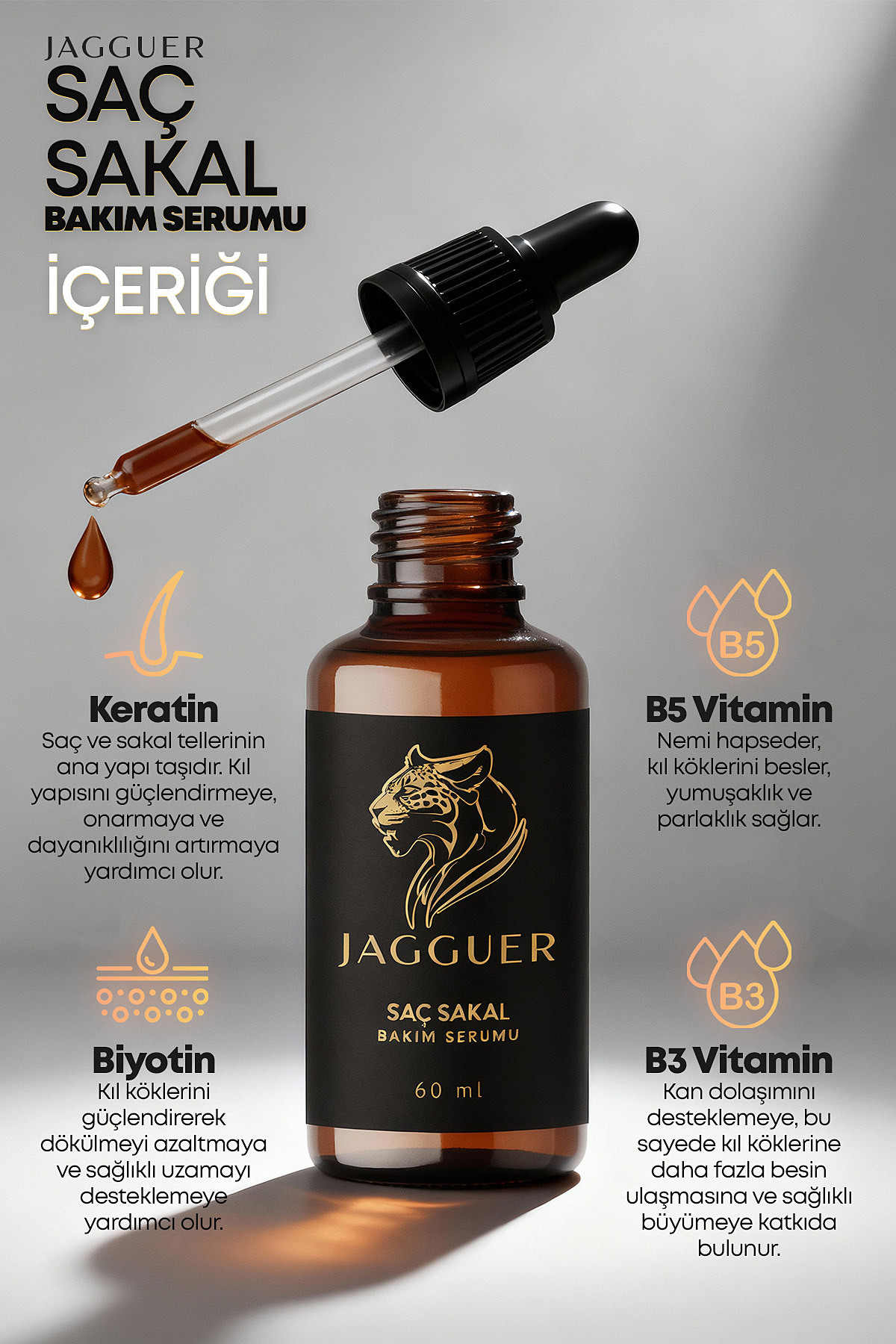 Bir damla JAGGUER serum bile saç ve sakal köklerinize hızla etki eder, onarmaya başlar ve çok kısa sürede farkı hissedersiniz -Saç & Sakal Köklerini Uyarır -Gür ve Sağlıklı Uzamayı Destekler -Kırılma ve Saç Kıran Problemini Onarır -Vitamin & Keratin Kompleksiyle Besler