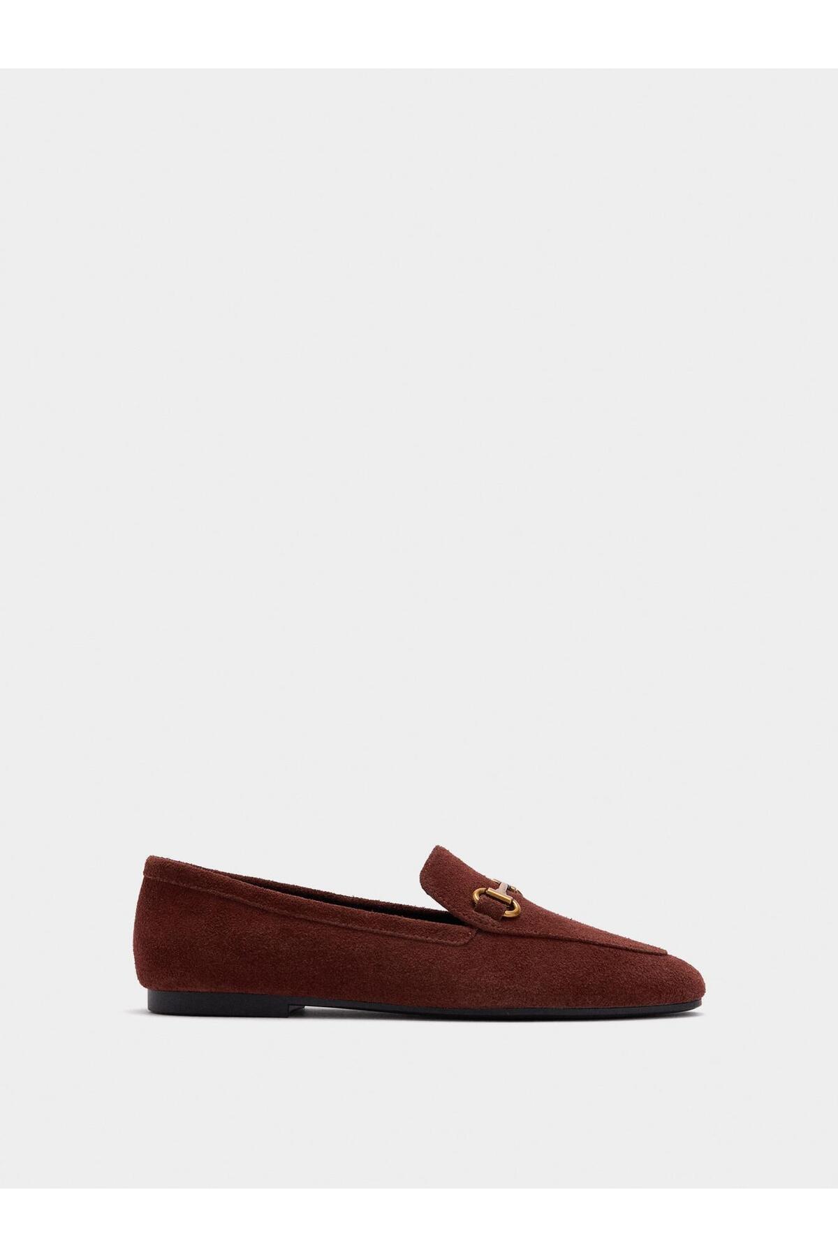 Önünde metalik toka detayı bulunan deri makosen.